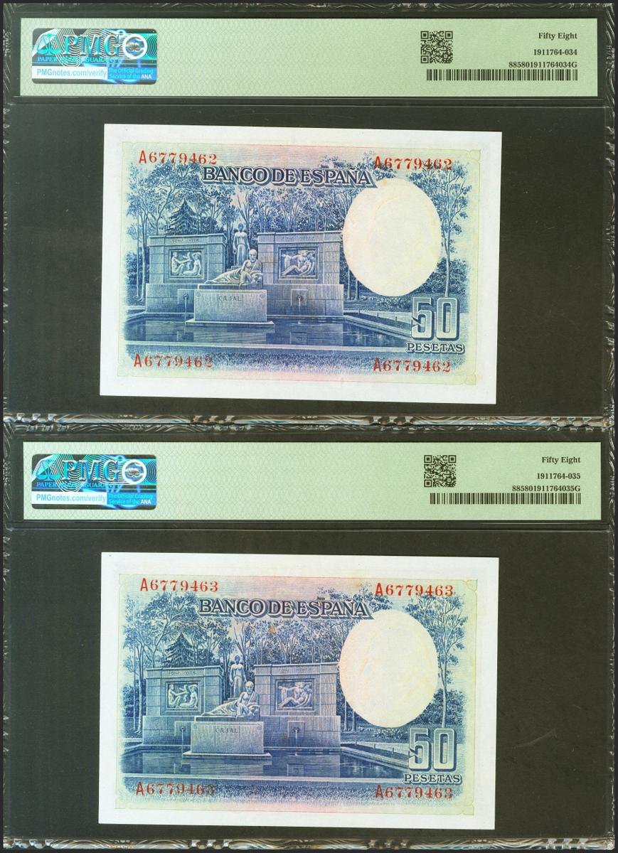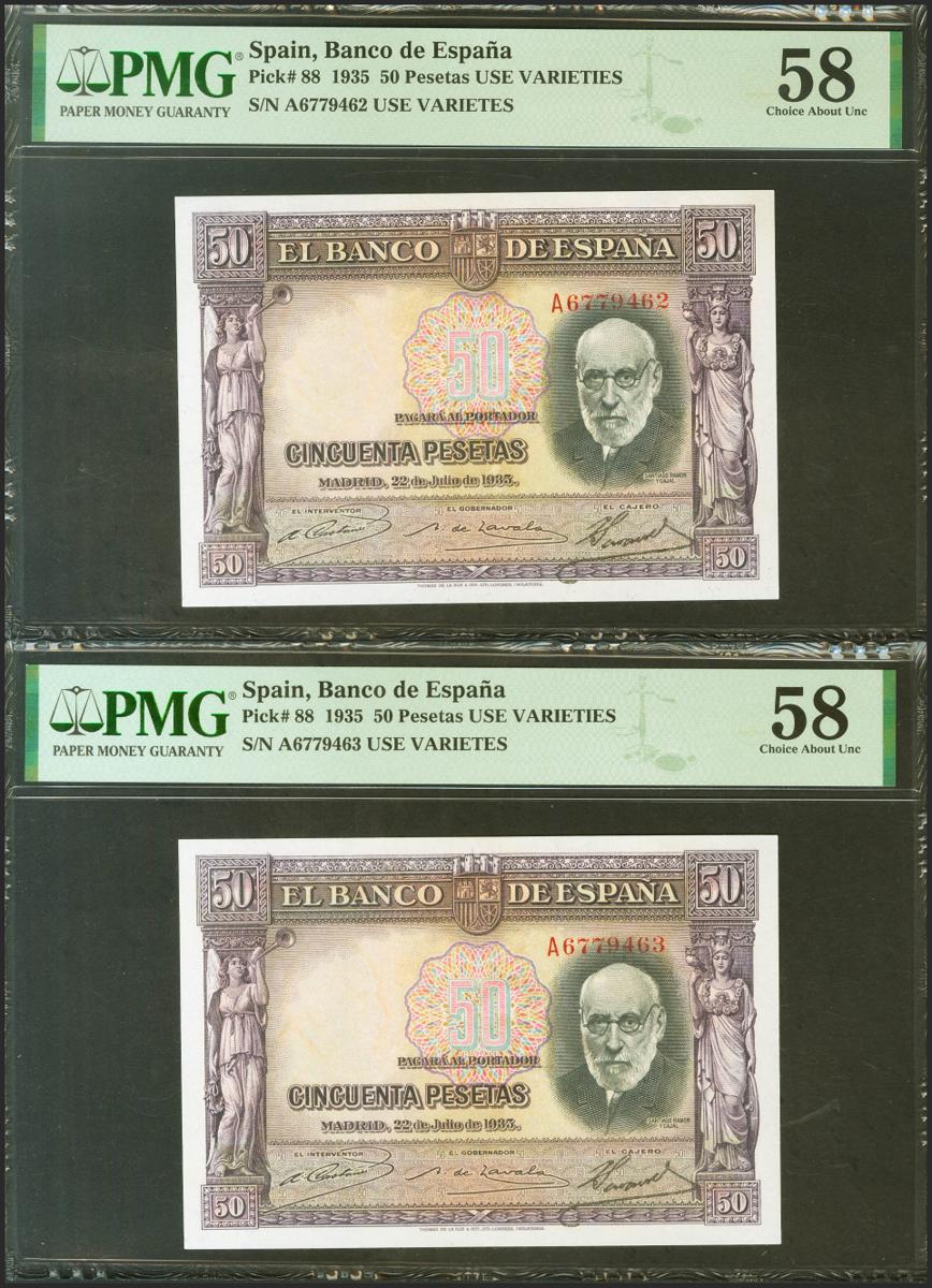 50 Pesetas. 22 de Julio de 1935. Pareja correlativa. Serie A. (Edifil 2021: 366a, Pick: 88b). EBC++. Encapsulados PMG58, ambos.