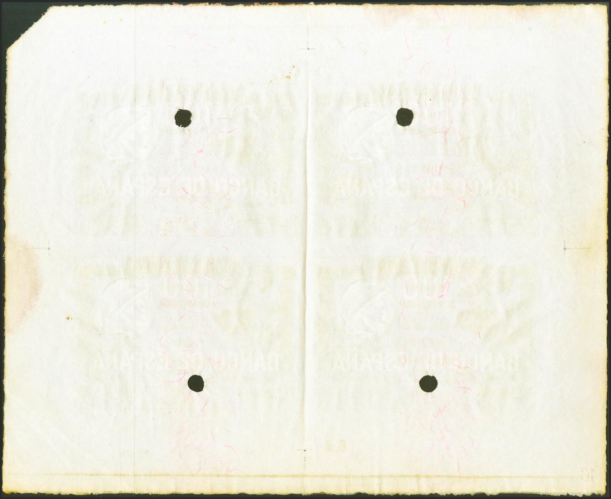 100 Pesetas Pesetas. 1 de Julio de 1903. Prueba de bloque de cuatro y taladrado. Sin numeración. (Edifil 2021: 310Pa). Muy raro, algún pliegue habitual sin importancia en piezas de este tamaño. EBC+.