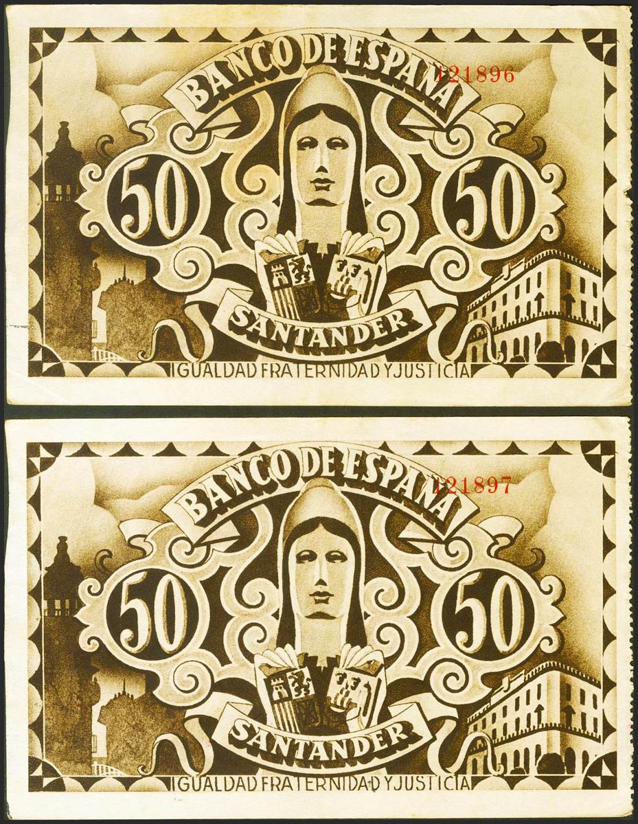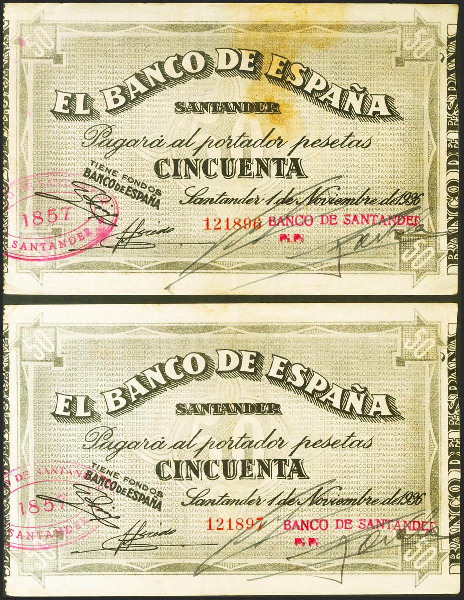50 Pesetas. 1 de Noviembre de 1936. Pareja correlativa. Banco de España, sucursal de Santander y antefirma Banco de Santader. (Edifil 2021: 378g). Rarísima pareja correlativa en esta buena calidad. EBC.