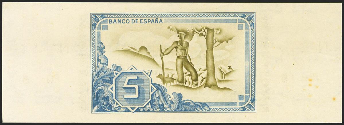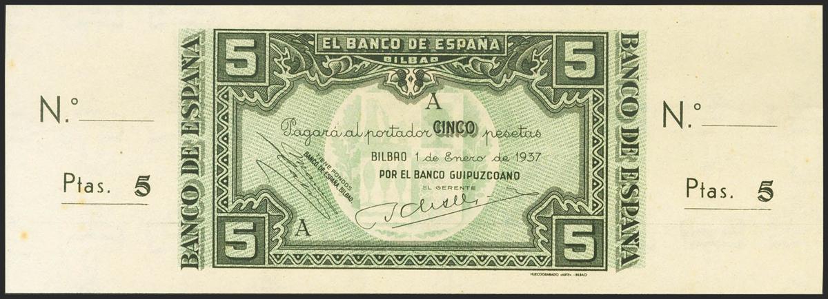 5 Pesetas. 1 de Enero de 1937. Sucursal de Bilbao, antefirma Banco Guipuzcoano. Serie A y sin numeración, con ambas matrices. (Edifil 2021: 386c). Apresto original y algún típico puntito de óxido. SC-.