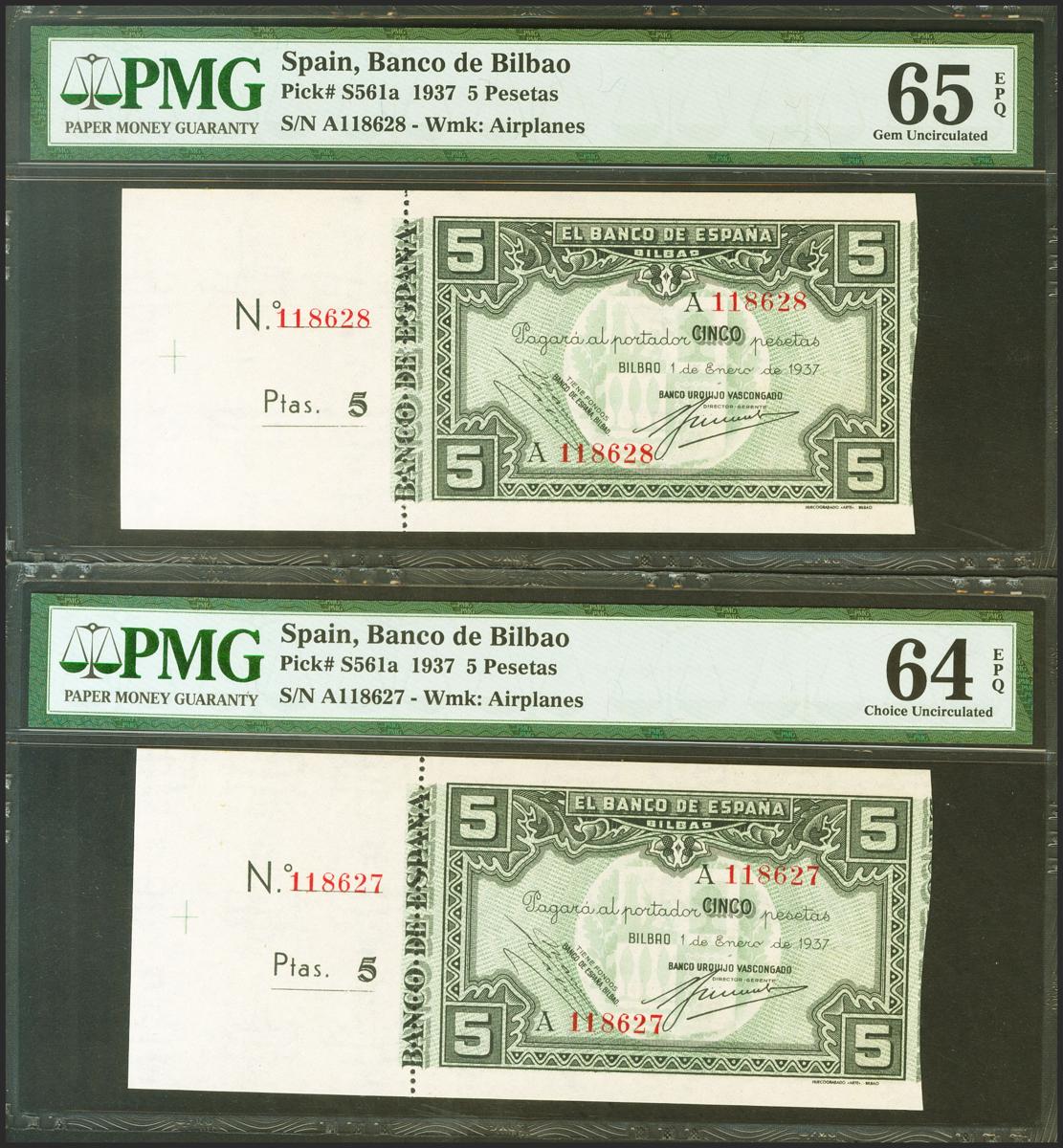 5 Pesetas. 1 de Enero de 1937. Pareja correlativa. Serie A, con matriz a la izquierda y antefirma del Banco Urquijo Vascongado. (Edifil 2021: 386f, Pick: S561a). Apresto original. SC. Encapsulados PMG65EPQ/64EPQ.