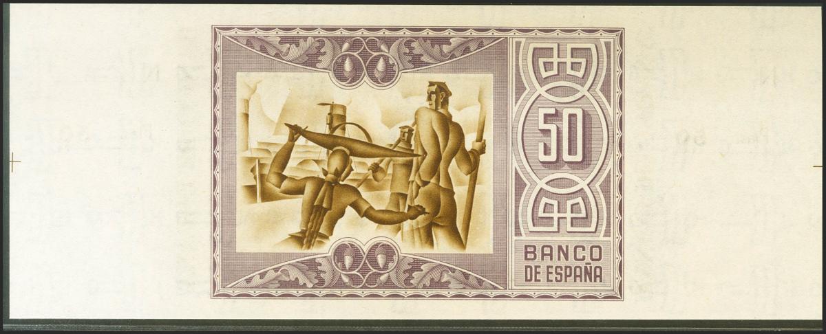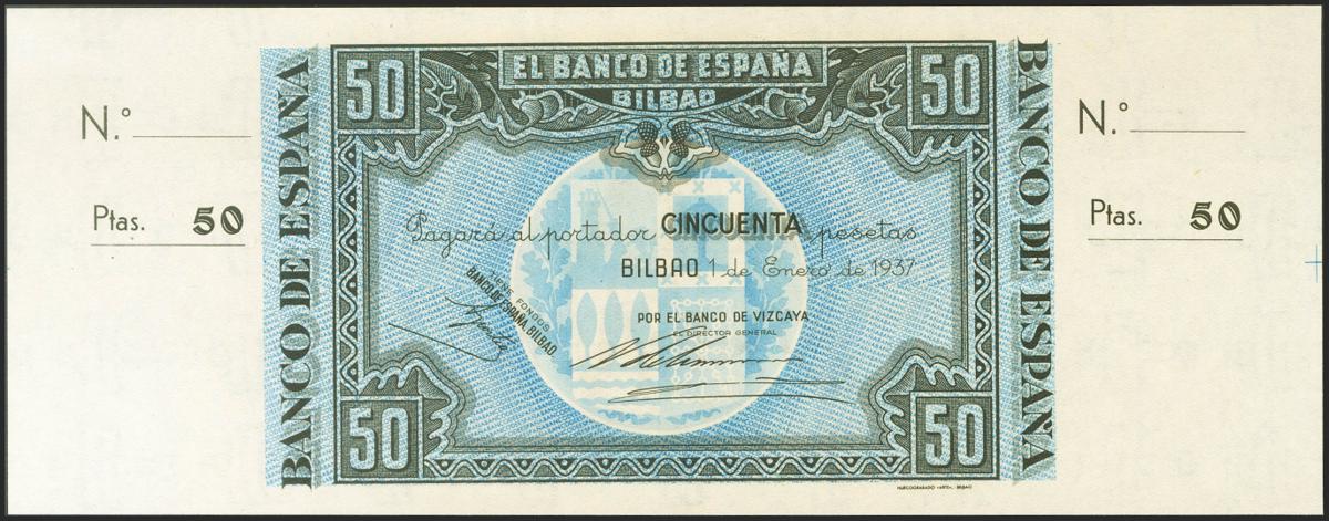 50 Pesetas. 1 de Enero de 1937. Sucursal de Bilbao, antefirma Banco Ahorros Vizcaya. Sin serie y sin numeración, con ambas matrices. (Edifil 2021: 389b). Apresto original. SC-.