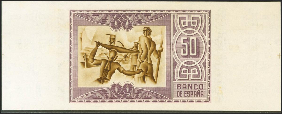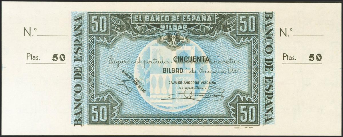 50 Pesetas. 1 de Enero de 1937. Sucursal de Bilbao, antefirma Banco Ahorros Vizcaína. Sin serie y sin numeración, con ambas matrices. (Edifil 2021: 389f). Apresto original. SC.