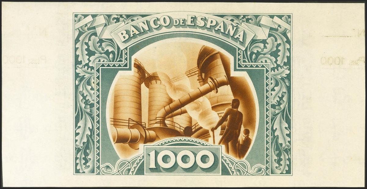 1000 Pesetas. 1 de Enero de 1937. Sucursal de Bilbao, antefirma Urquijo Vascongado. No emitido, sin serie y sin numeración, con ambas matrices (con el tamaño más estrecho de lo que debería ser habitual). (Edifil 2021: NE27f). Apresto original y algún típico puntito de óxido. SC-.