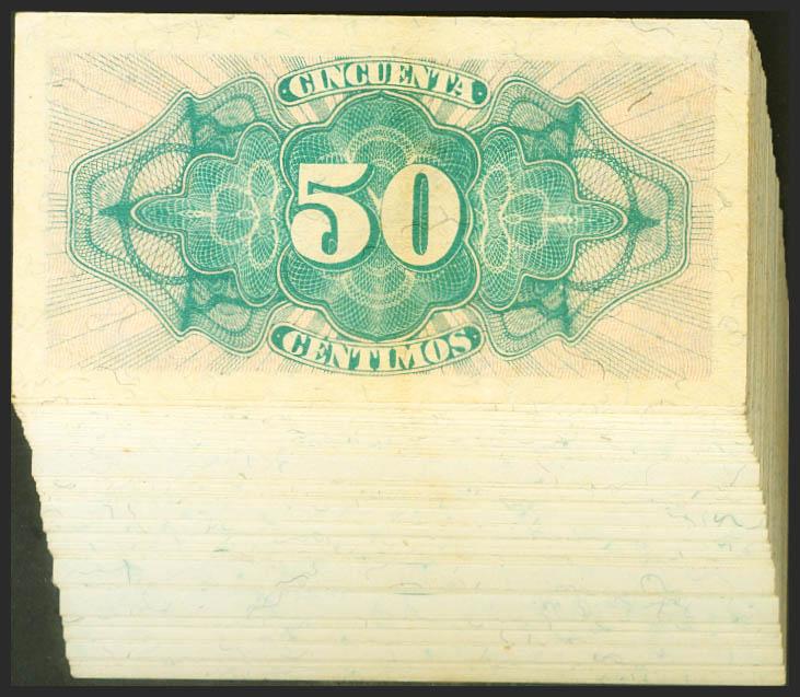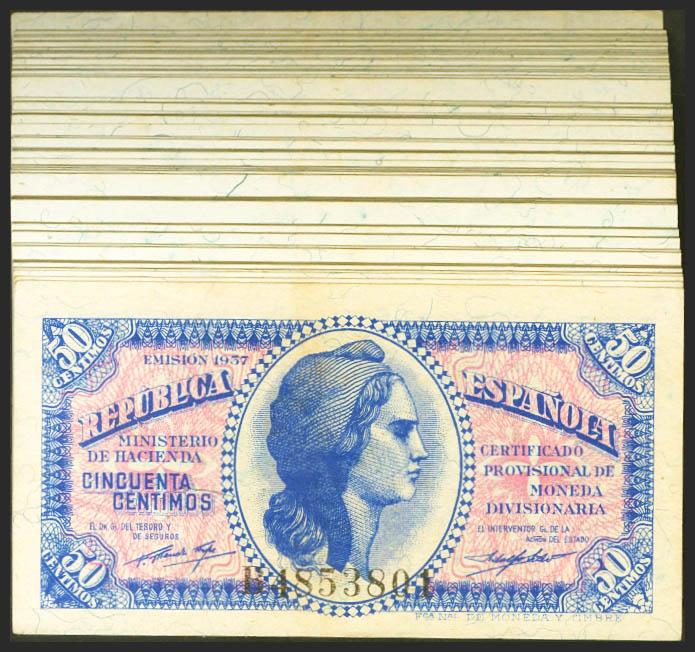 Conjunto de 94 billetes correlativos de 50 Centimos emitidos el 1937 con la serie B, (Edifil 2021: 391), conservando todo su apresto original. SC/SC-.