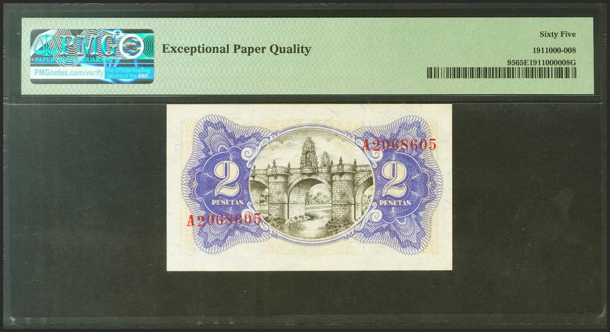 2 Pesetas. 1938. Ministerio de Hacienda. Serie A. (Edifil 2021: 393, Pick: 95). Apresto original. SC. Encapsulado PMG65EPQ.