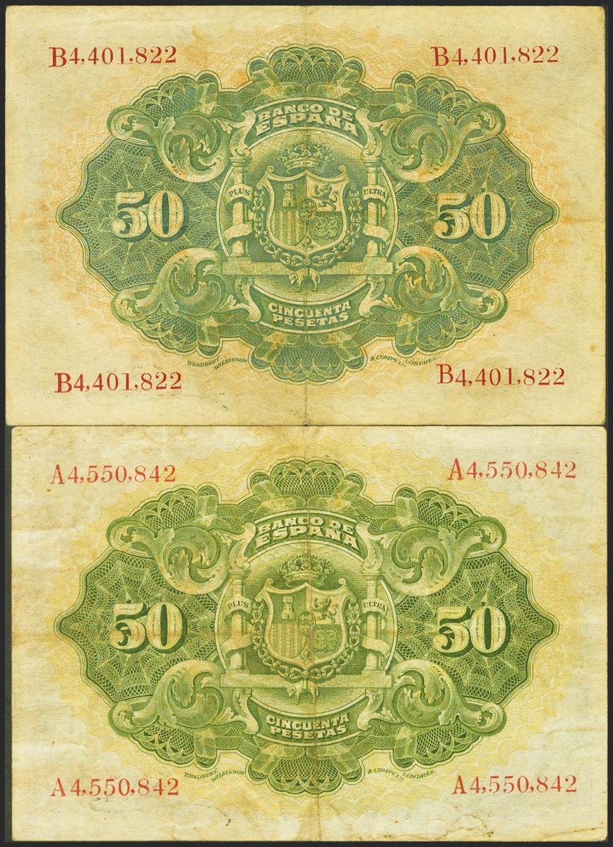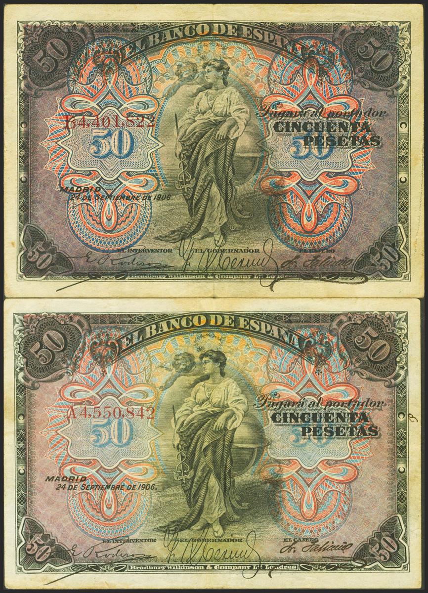 Conjunto de 2 billetes de 50 Pesetas emitidos el 24 de Septiembre de 1906 con las series A y B respectivamente y sello en seco "ESTADO ESPAÑOL / BURGOS". (Edifil 2021: 404). MBC.