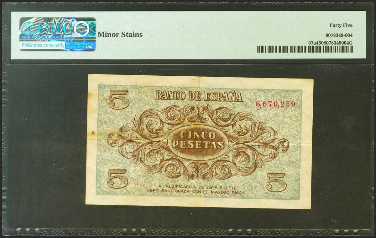 5 Pesetas. 21 de Noviembre de 1936. Sin serie. (Edifil 2021: 417, Pick: 97a). Inusual, manchitas de óxido. EBC-. Encapsulado PMG45.