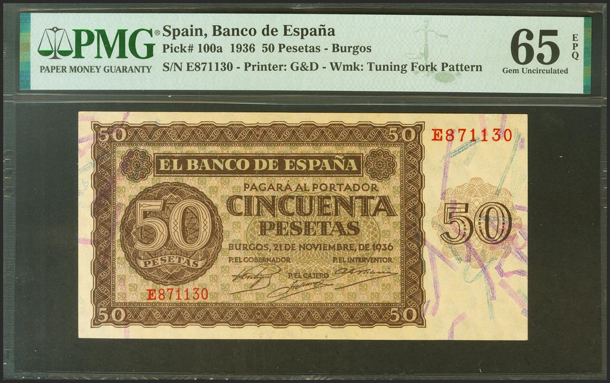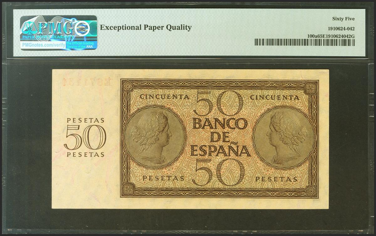 50 Pesetas. 21 de Noviembre de 1936. Serie E. (Edifil 2021: 420a). Inusual en esta excepcional calidad, apresto original. SC. Encapsulado PMG65EPQ.