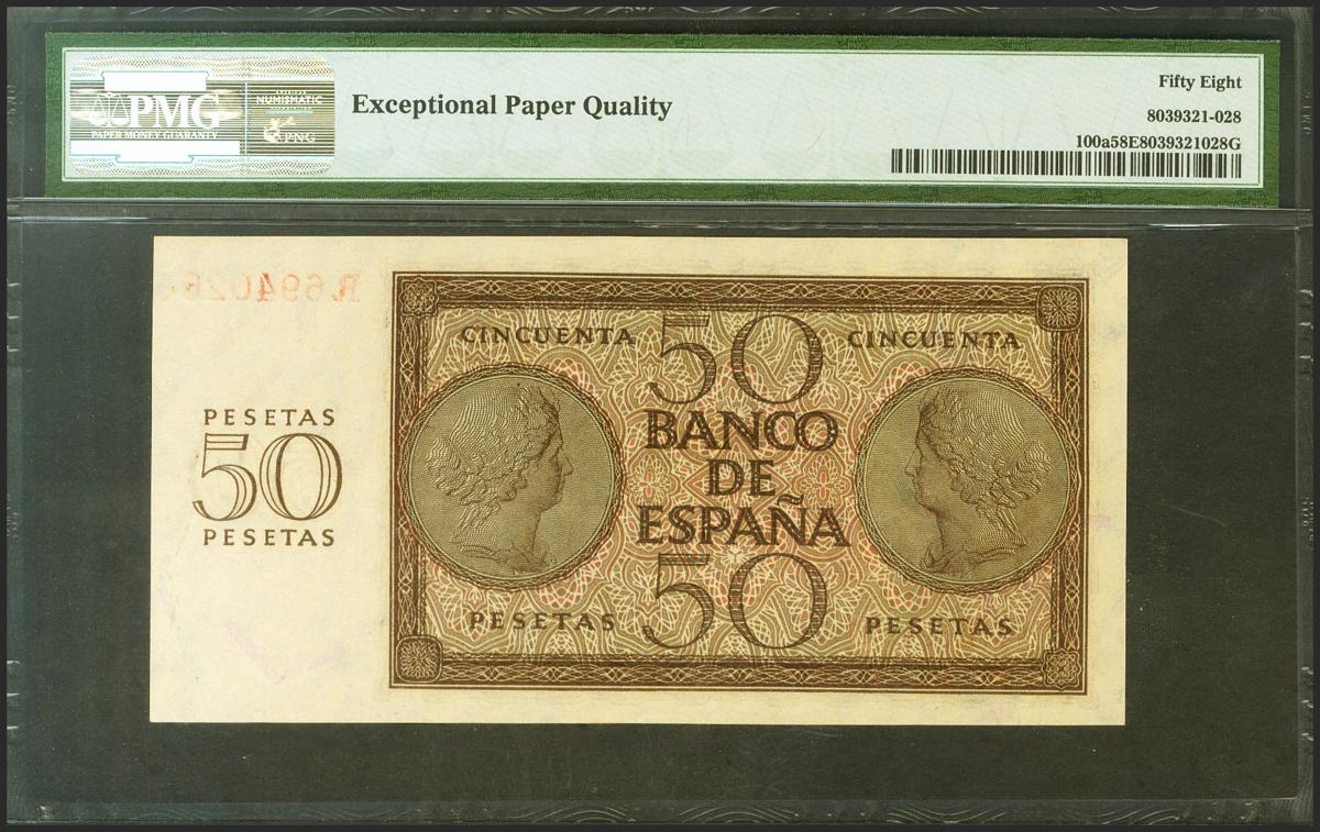 50 Pesetas. 21 de Noviembre de 1936. Serie R. (Edifil 2021: 420a, Pick: 100a). Apresto original. EBC+++. Encapsulado PMG58EPQ.