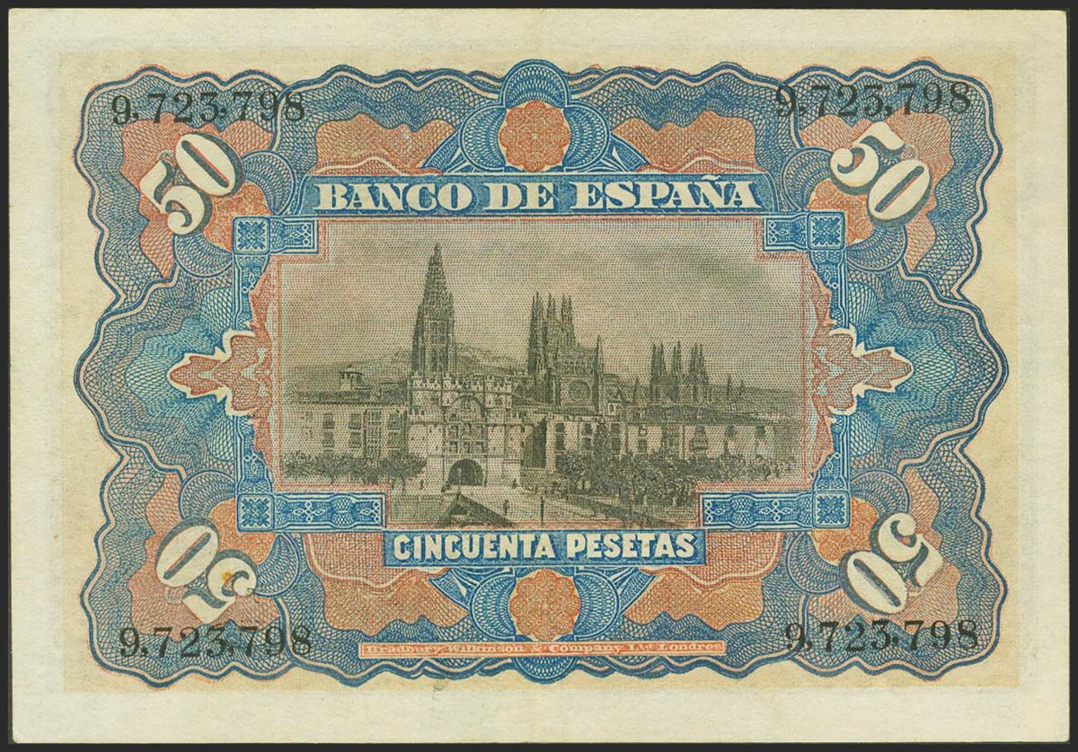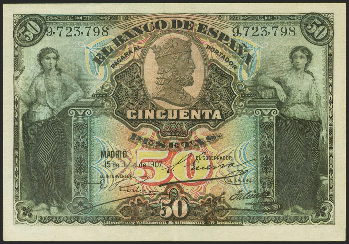 50 Pesetas. 15 de Julio de 1907. Sin serie. (Edifil 2017: 319). Puntito de grapa. EBC.