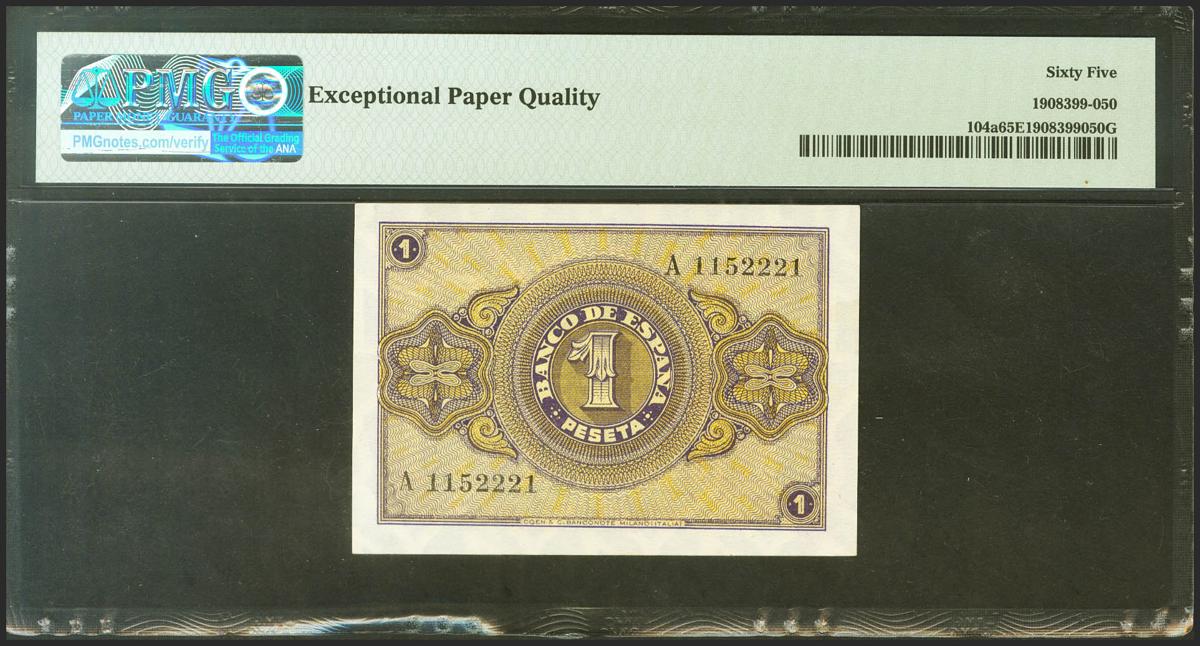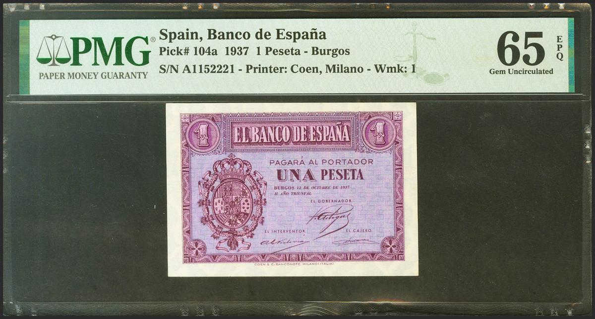 1 Peseta. 12 de Octubre de 1937. Serie A. (Edifil 2021: 425, Pick: 104a). Inusual en esta excepcional calidad, apresto original. SC. Encapsulado PMG65EPQ.