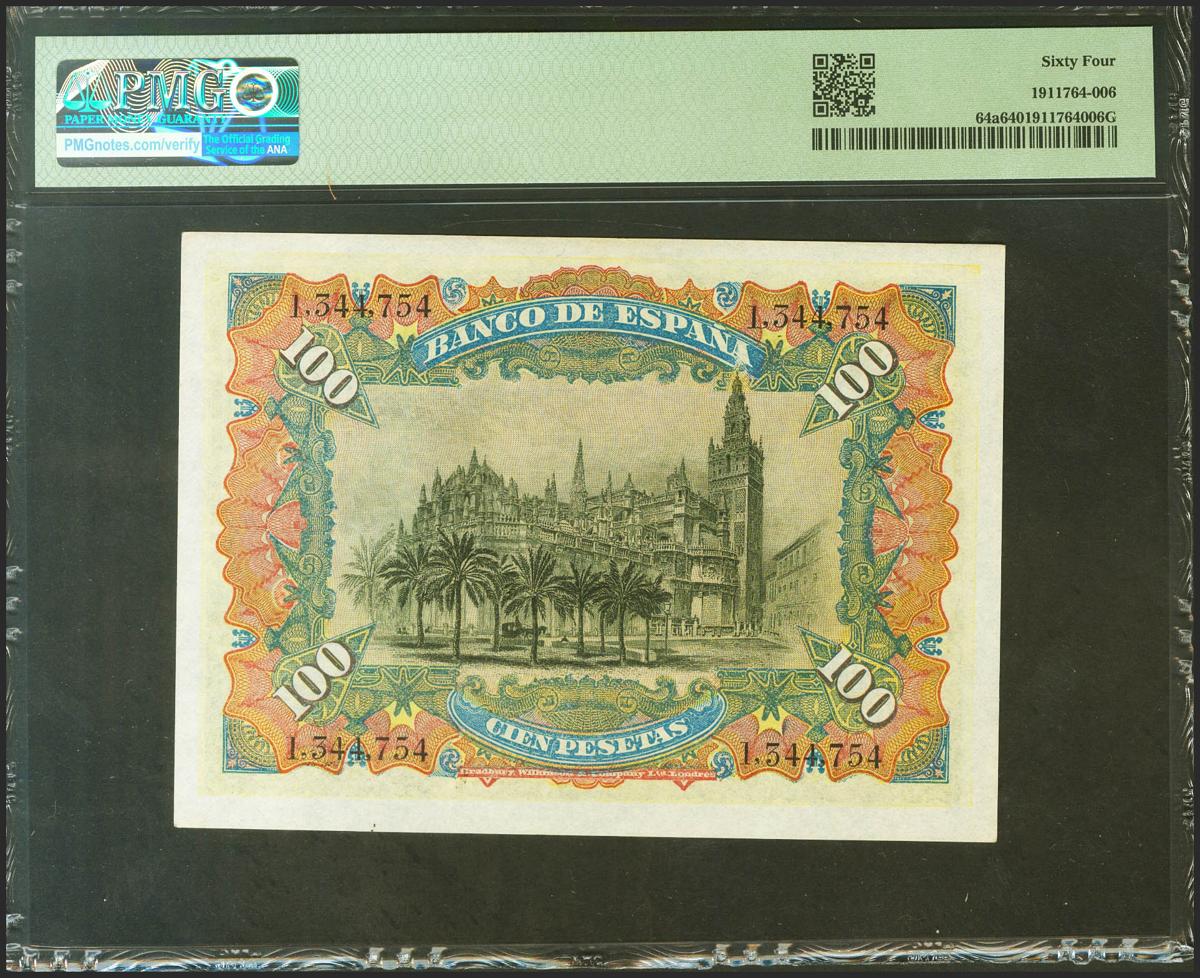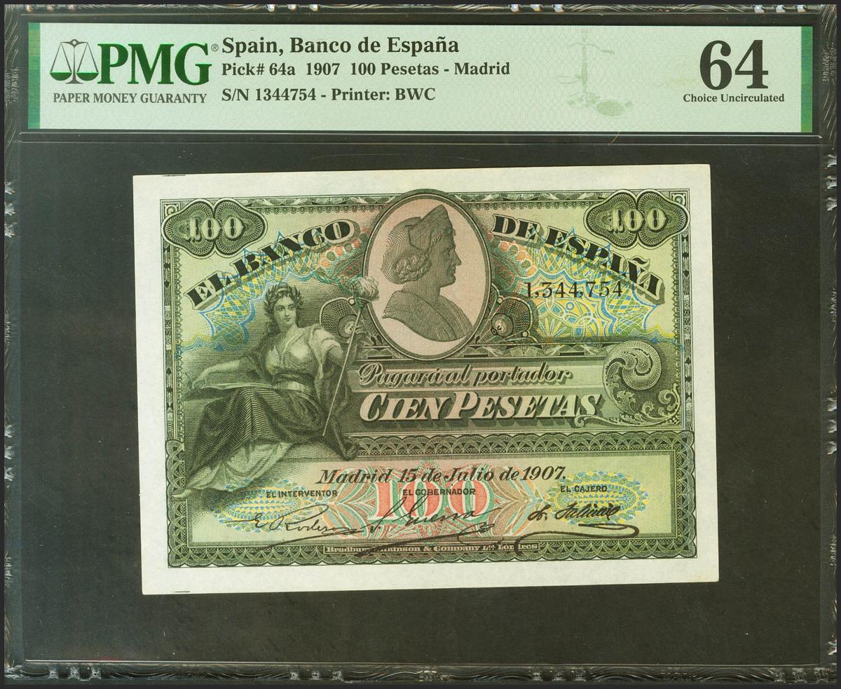 100 Pesetas. 15 de Julio de 1907. Sin serie. (Edifil 2021: 320, Pick: 64a). Raro, especialmente en esta calidad. SC. Encapsulado PMG64.