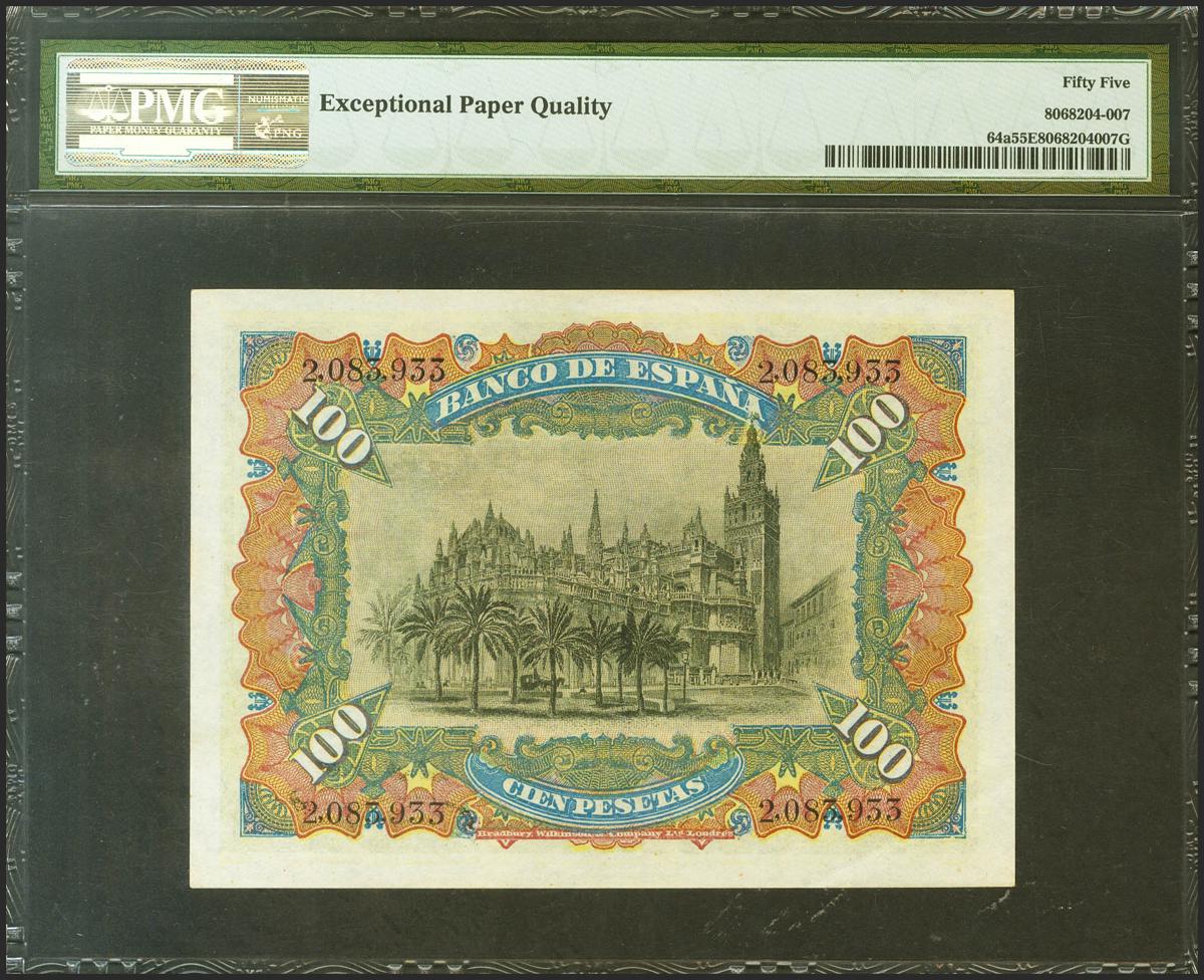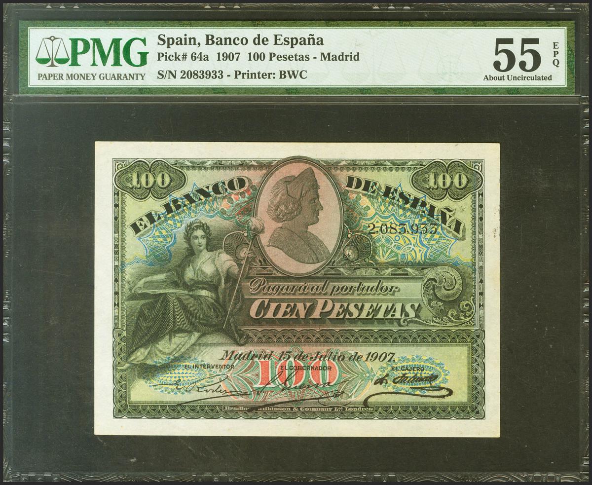 100 Pesetas. 15 de Julio de 1907. Sin serie. (Edifil 2021: 320, Pick: 64a). Inusual en esta calidad, con apresto original. EBC+. Encapsulado PMG55EPQ.