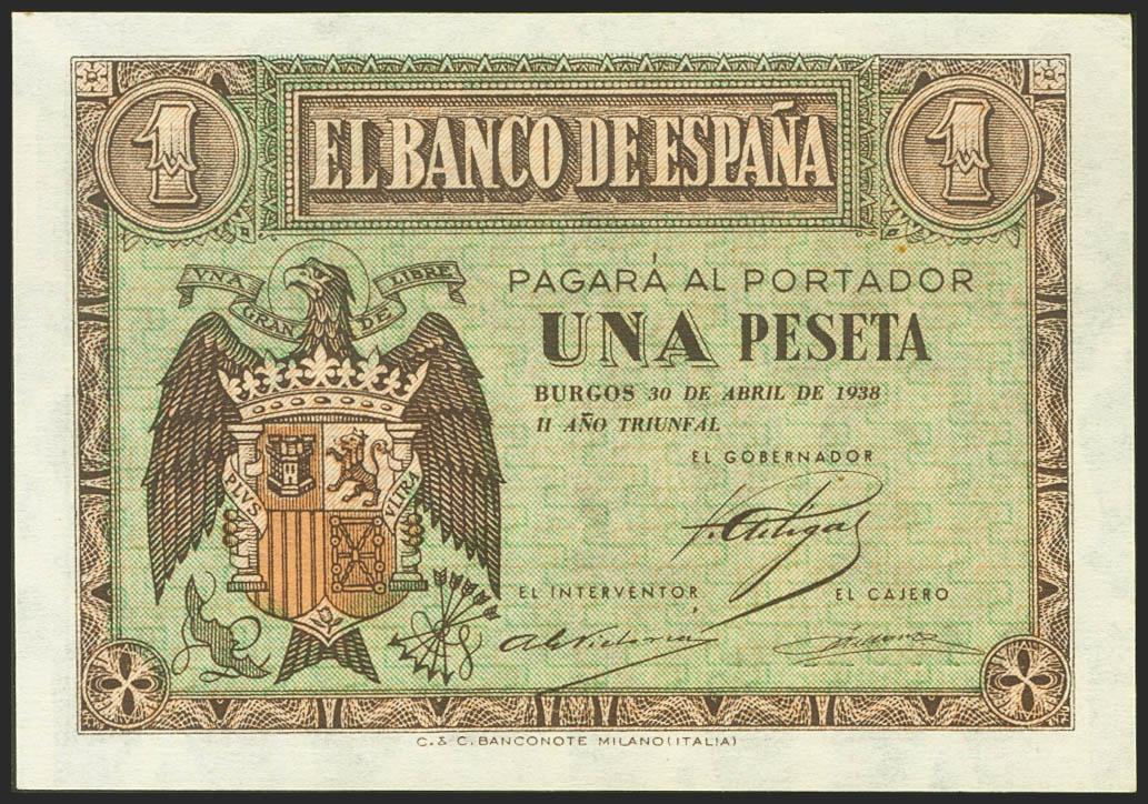 1 Peseta. 30 de Abril de 1938. Serie A. (Edifil 2017: 428). Apresto original. SC-.