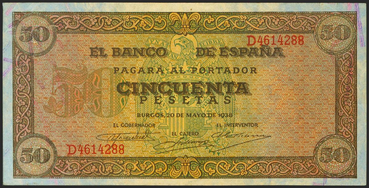 50 Pesetas. 20 de Mayo de 1938. Serie D. (Edifil 2021: 431a). Apresto original, arruguitas naturales del papel (este es el único motivo de "quitarle" el SC). EBC+++.