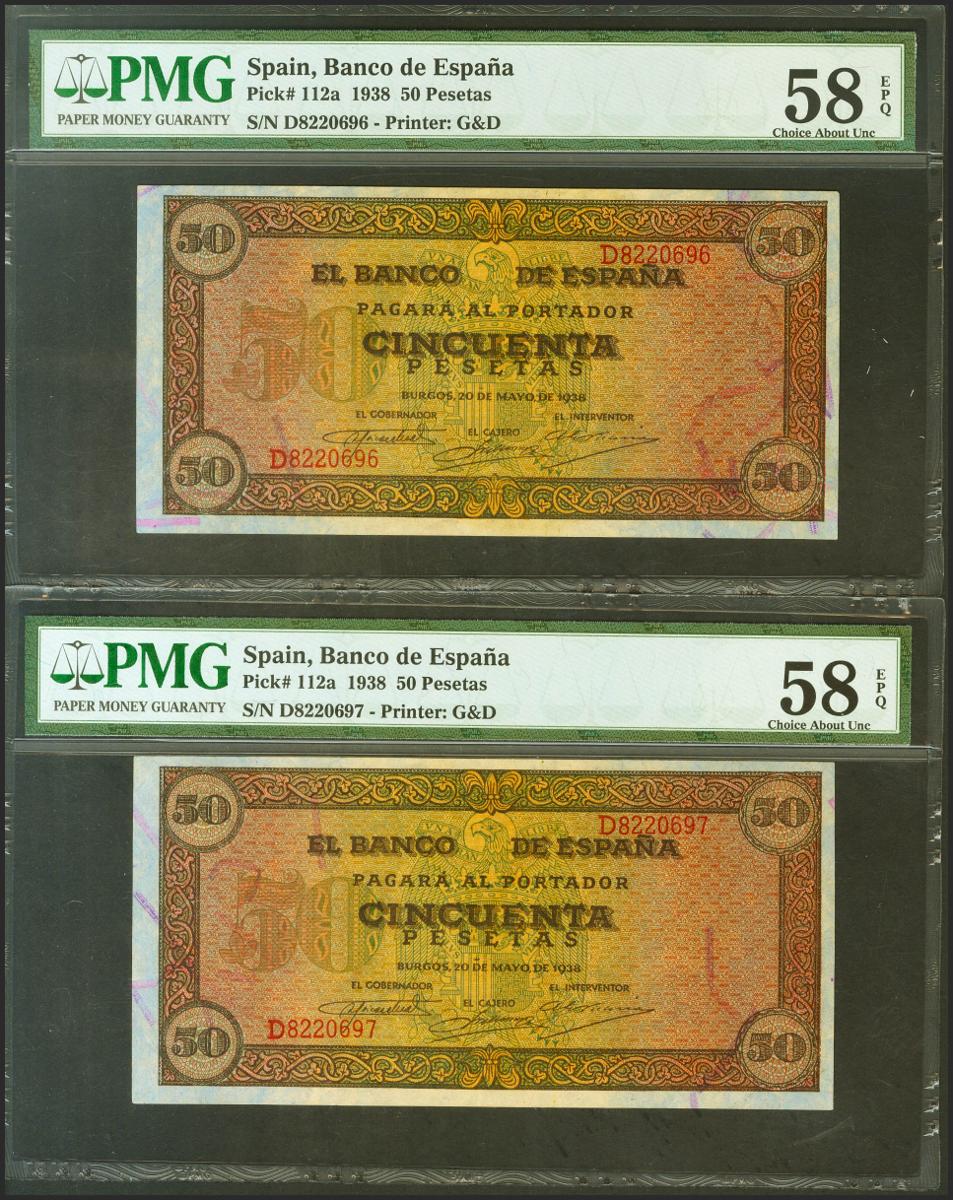50 Pesetas. 20 de Mayo de 1938. Pareja correlativa. Serie D. (Edifil 2021: 431a, Pick: 112a). Muy atractiva e inusual pareja, apresto original. EBC+++. Encapsulados PMG58EPQ, ambos.