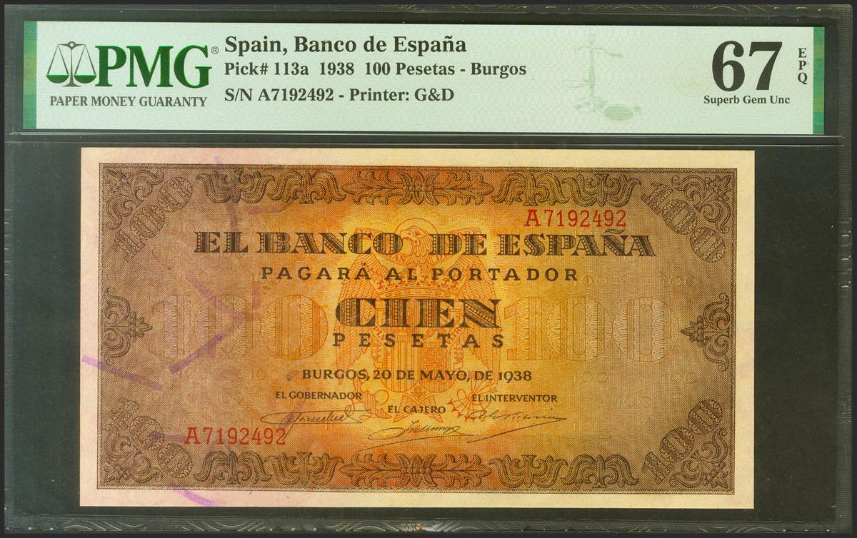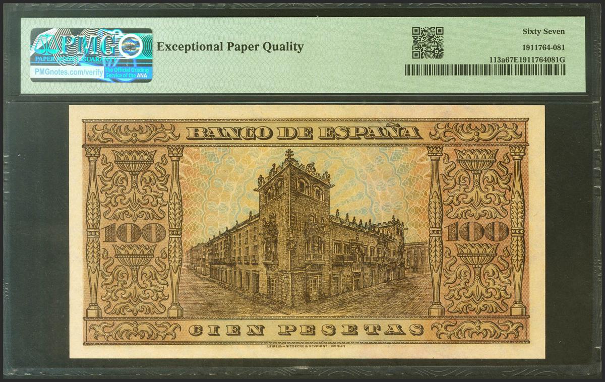 100 Pesetas. 20 de Mayo de 1938. Serie A. (Edifil 2021: 432, Pick: 113a). Extraordinariamente raro en esta excepcional calidad, apresto original. SC. Encapsulado PMG67EPQ. (para hacernos idea de la rareza, a fecha 1/12/2022, el billete se trata del mejor calificado en PMG junto a otros 11 billetes)