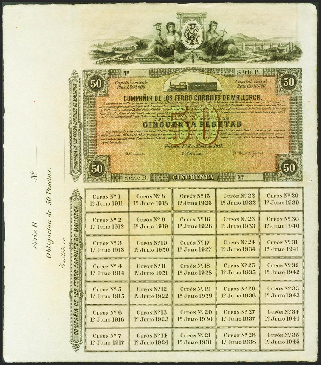 COMPAÑIA DE LOS FERROCARRILES (MALLORCA). Obligación de 50 Pesetas. 1911. Raro, especialmente con la matriz y los cupones. Para entender mejor la contextualización de este billete recomendamos la obra "Obligaciones, vales y documentos puestos en circulación como papel moneda en España", de Don Ramón Cobo Huici. SC-.