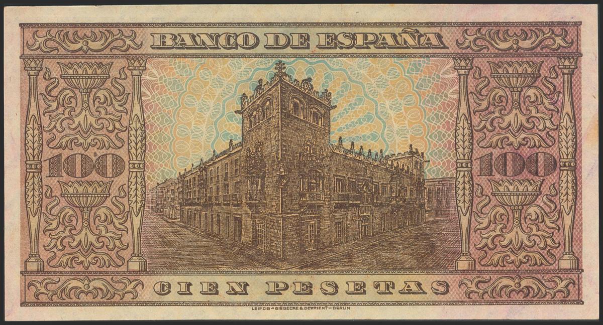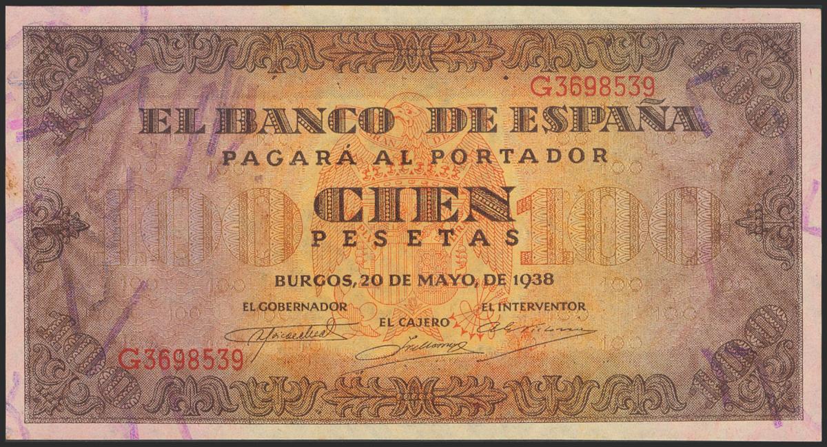 100 Pesetas. 20 de Mayo de 1938. Serie G. (Edifil 2021: 432a). Conserva todo su apresto original, presenta una manchita de escasa consideración en el margen izquierdo. SC-.