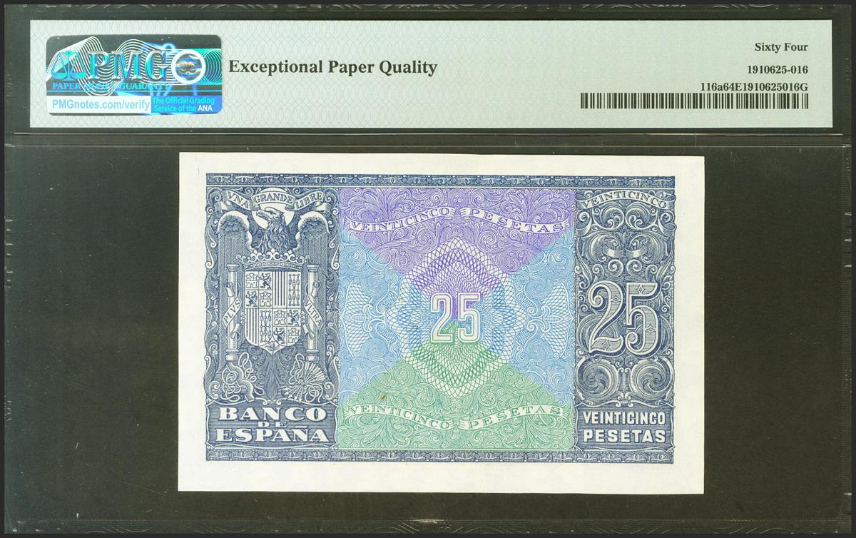 25 Pesetas. 9 de Enero de 1940. Serie D. (Edifil 2021: 436a). Inusual en esta excepcional calidad, apresto original. SC. Encapsulado PMG64EPQ.