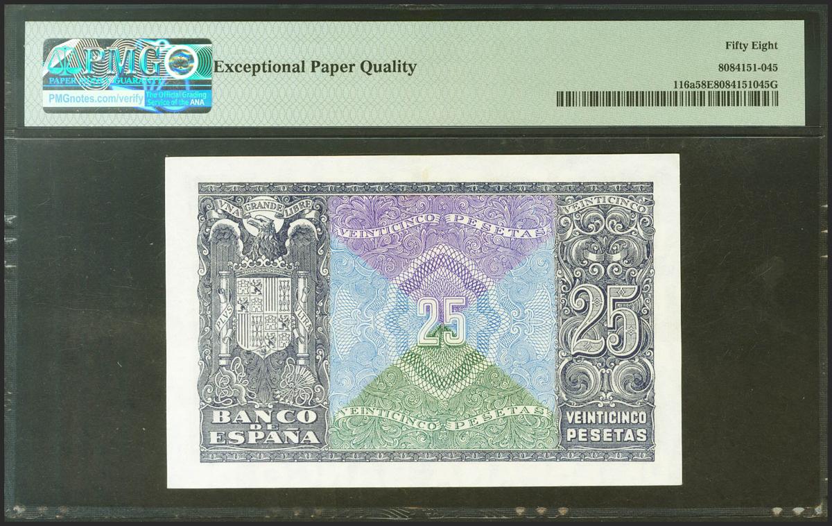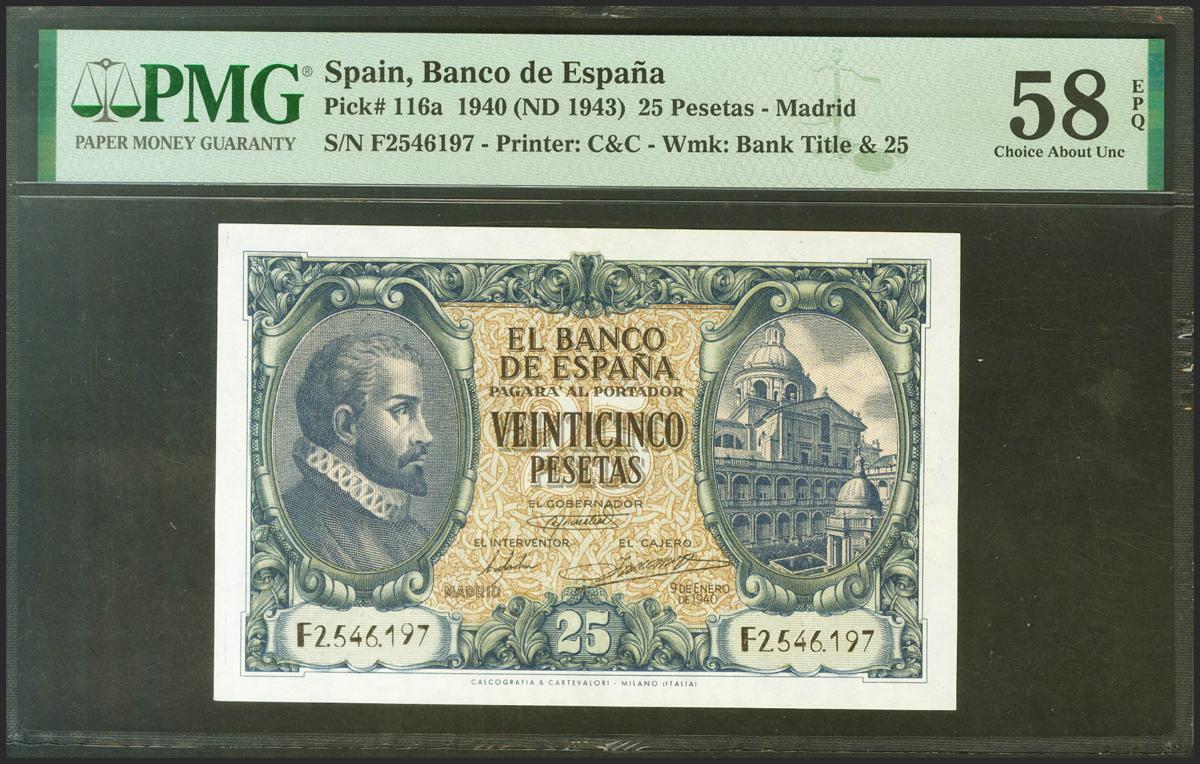 25 Pesetas. 9 de Enero de 1940. Serie F, última serie emitida. (Edifil 2021: 436a, Pick: 116a). Apresto original. EBC+++. Encapsulado PMG58EPQ.