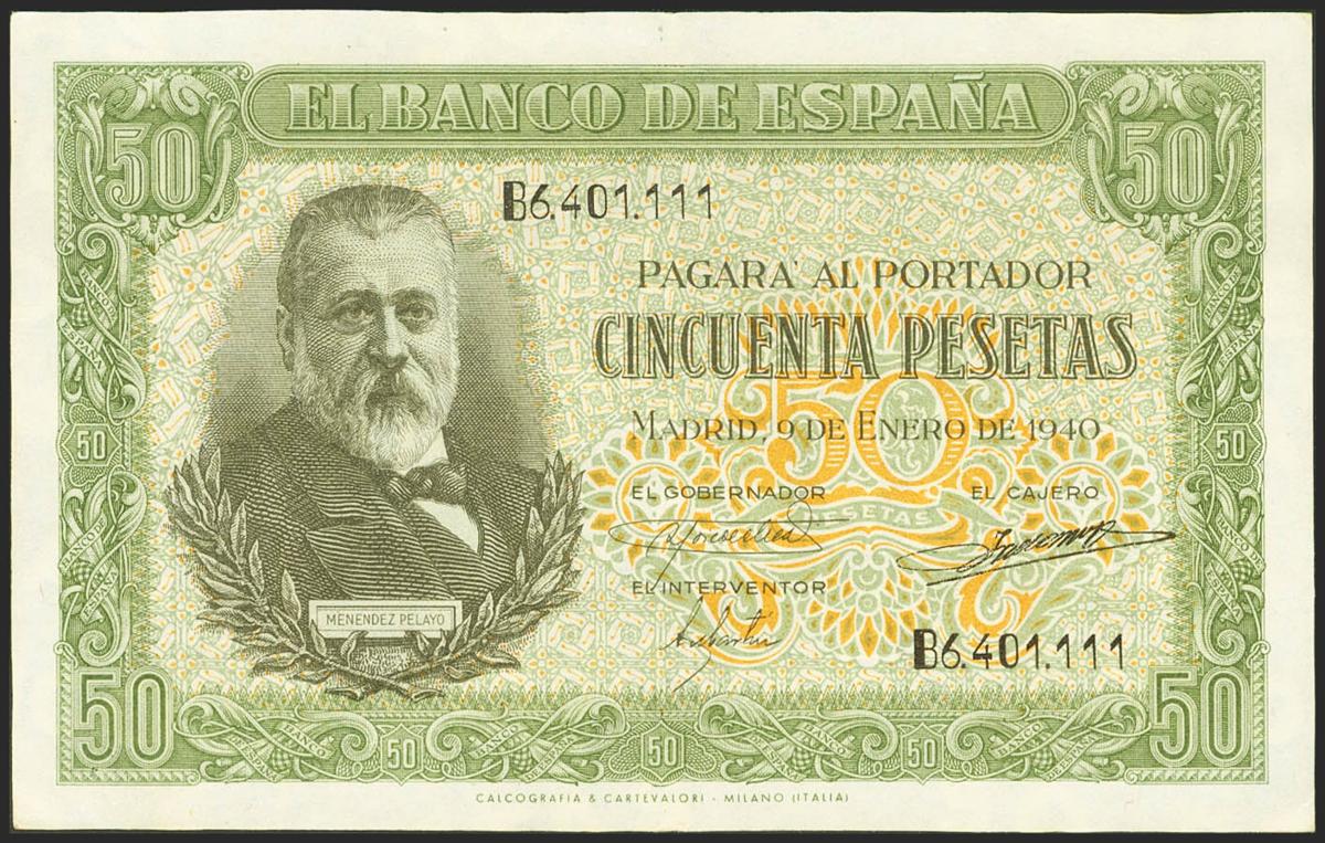 50 Pesetas. 9 de Enero de 1940. Serie B. (Edifil 2021: 437a). Conserva gran parte de su apresto original. EBC.