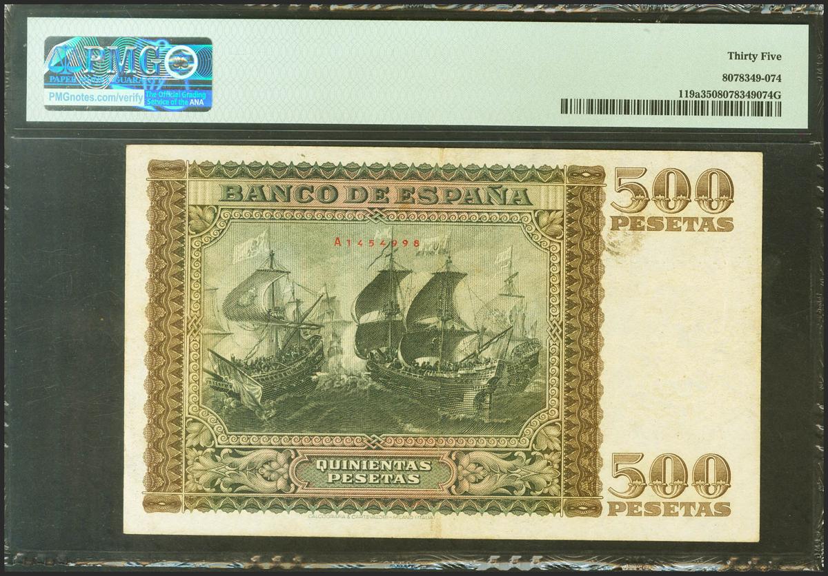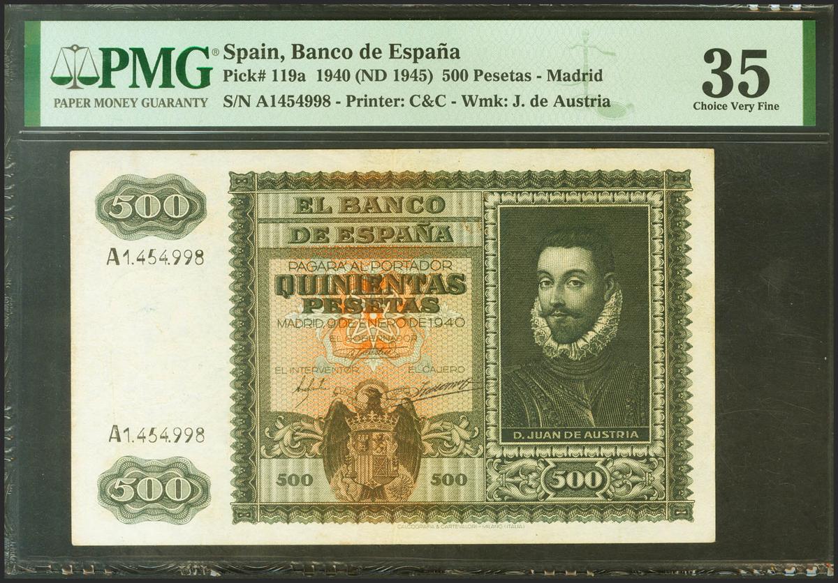 500 Pesetas. 9 de Enero de 1940. Serie A. (Edifil 2021: 439, Pick: 119a). Inusual sin ninguna reparación. MBC. Encapsulado PMG35.