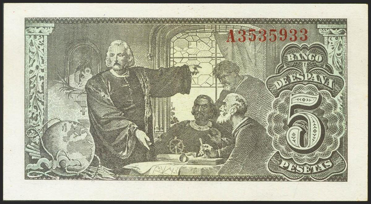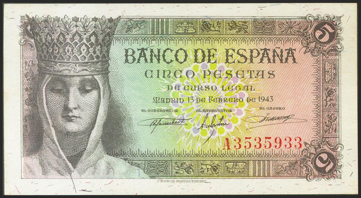 5 Pesetas. 13 de Febrero de 1943. Serie A. (Edifil 2021: 446a). Apresto original. SC-.