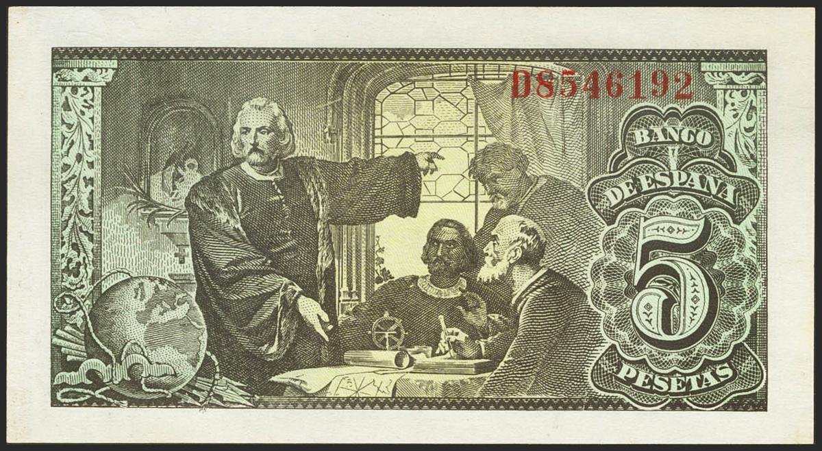 5 Pesetas. 13 de Febrero de 1943. Serie D. (Edifil 2021: 446a). Conserva gran parte de su apresto original. EBC+++.