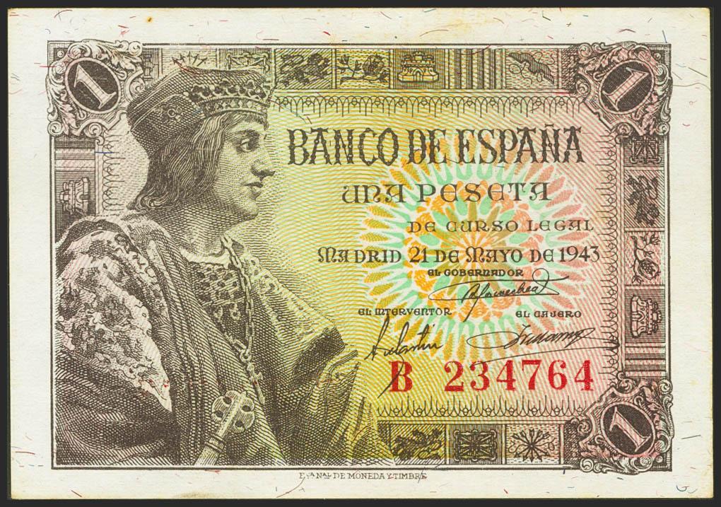 1 Peseta. 21 de Mayo de 1943. Serie B. (Edifil 2021: 447a). Apresto original. EBC+.