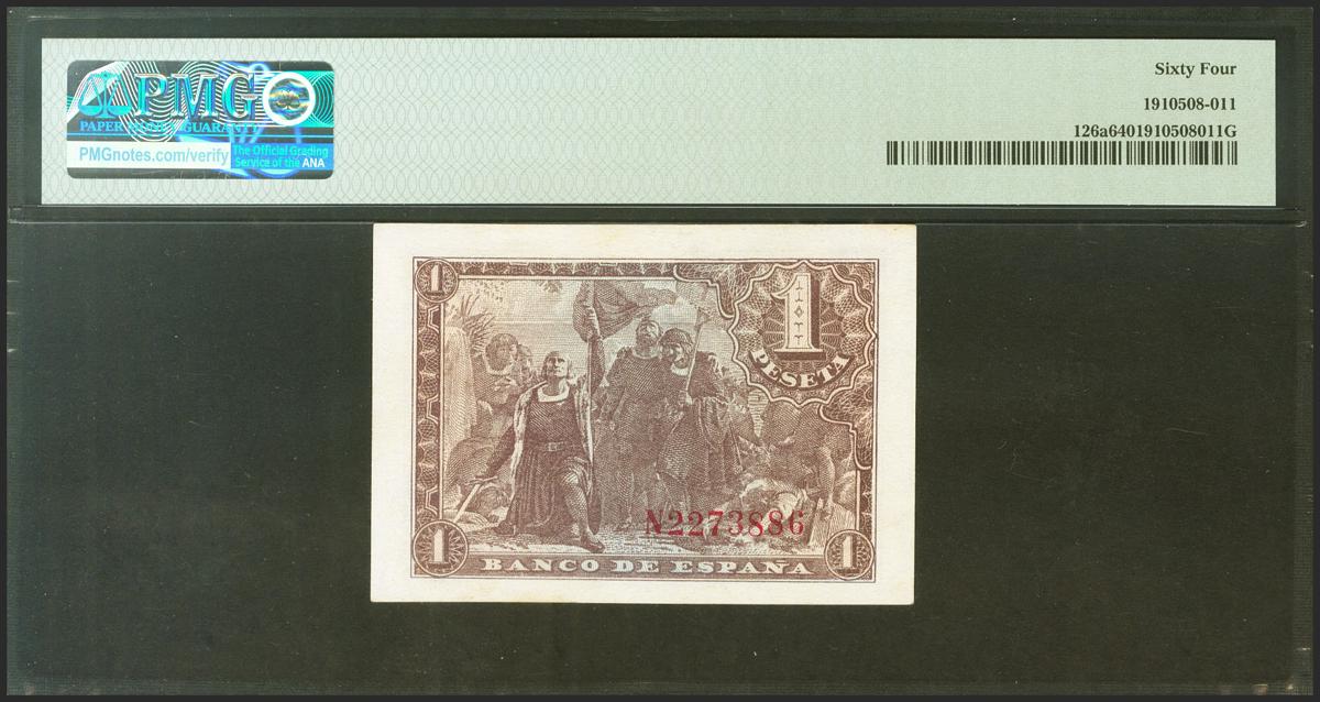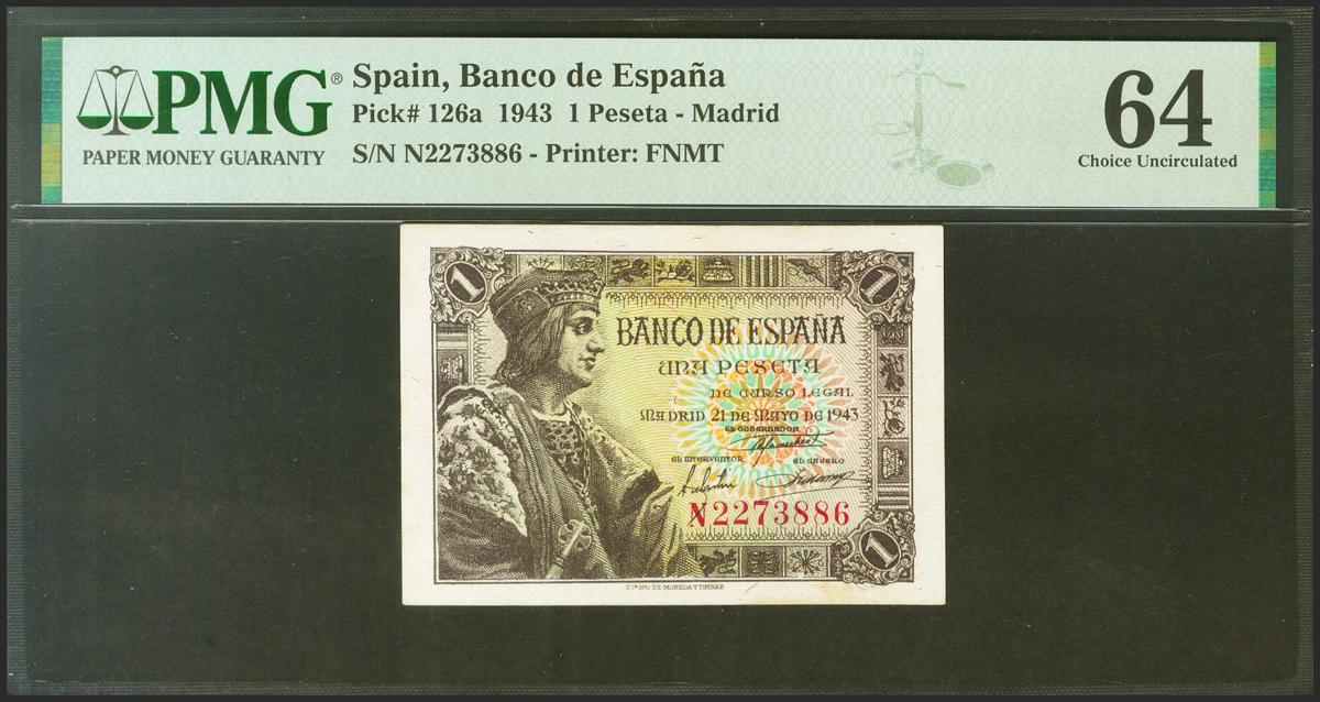 1 Peseta. 21 de Mayo de 1943. Serie N, última serie emitida. (Edifil 2021: 447a, Pick: 126a). SC. Encapsulado PMG64