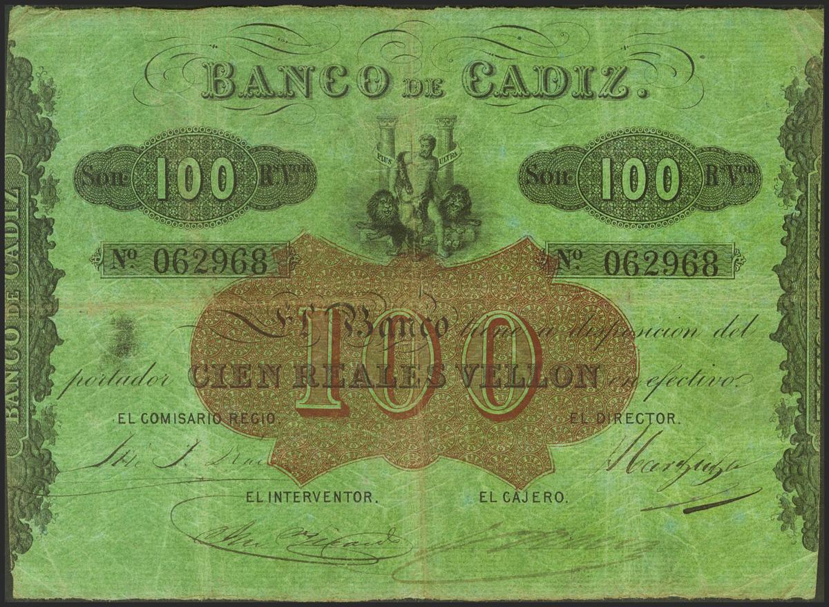 100 Reales. Sin fecha. Emisión III. (Edifil 2021: 78). Habituales erosiones que acompañan a los dobleces. MBC+.