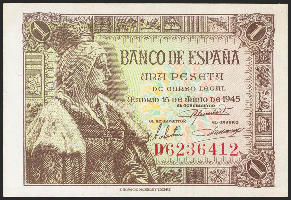1 Peseta. 15 de Junio de 1945. Serie D. (Edifil 2021: 448a). Apresto original. SC-.