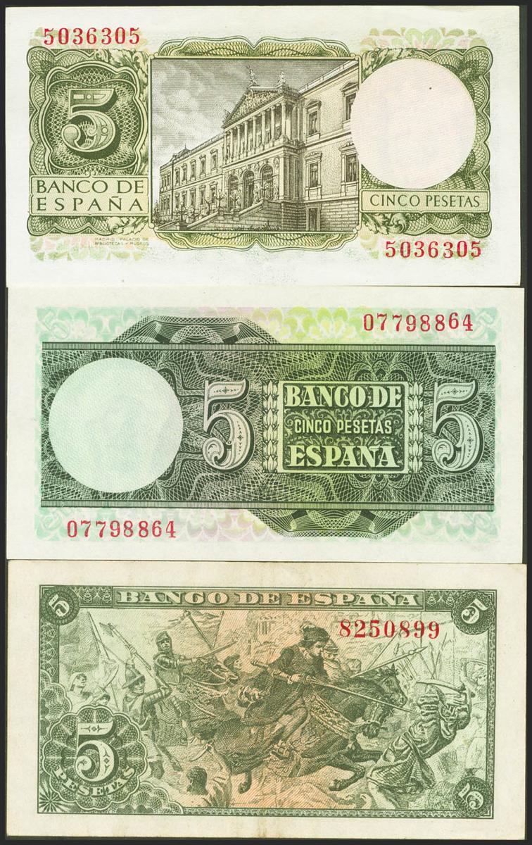 Conjunto de 3 billetes de 5 pesetas emitidos el 15 de Junio de 1945, 5 de Marzo de 1948 y 22 de Julio de 1954, todos ellos sin serie (Edifil 2021: 449, 455 y 466). EBC+.