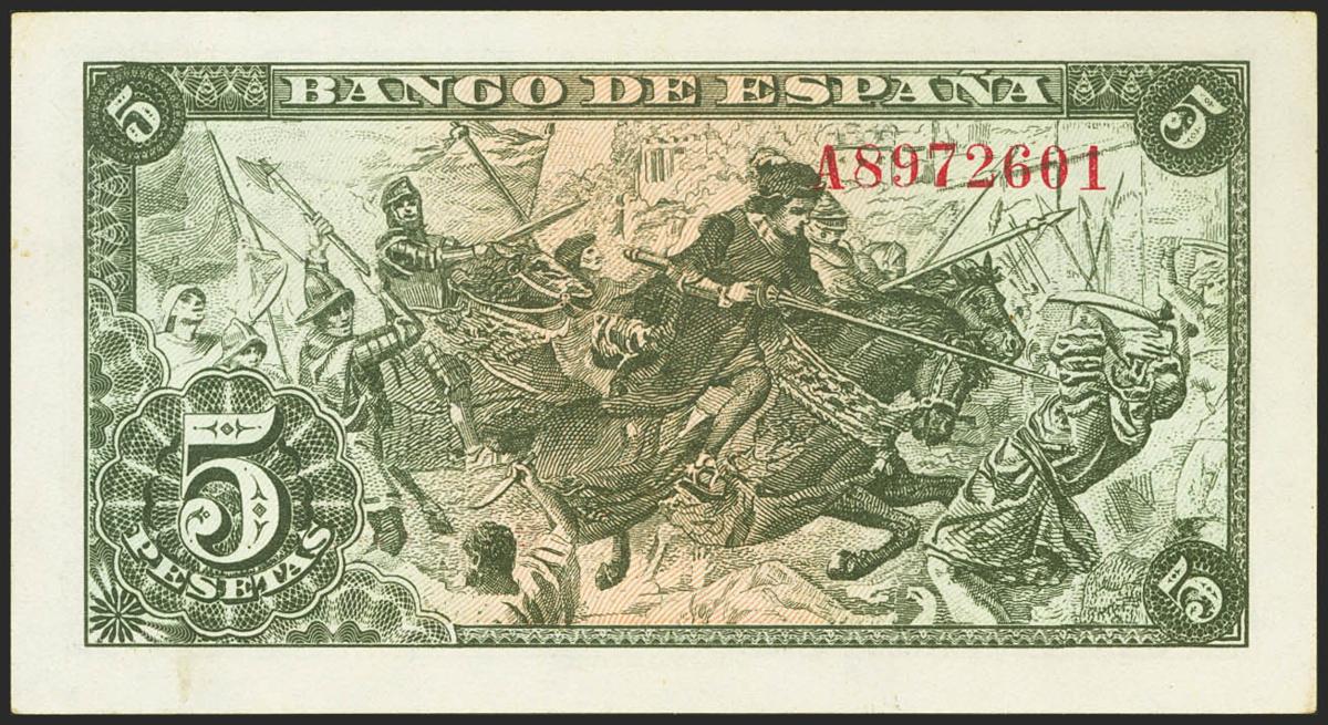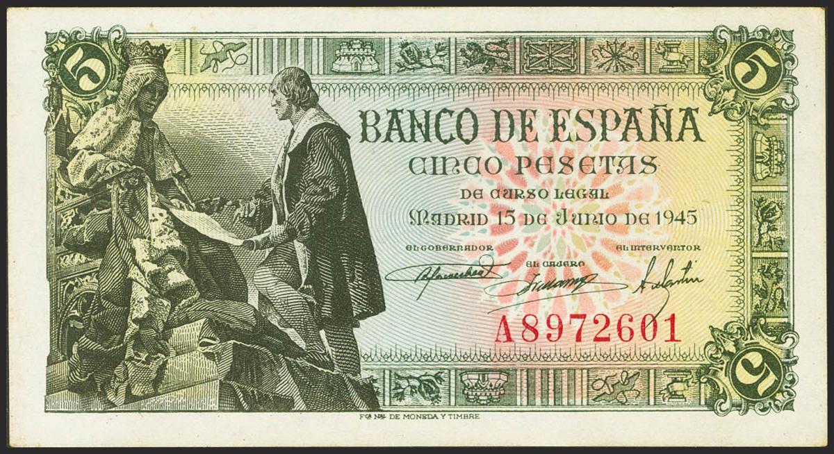 5 Pesetas. 15 de Junio de 1945. Serie A. (Edifil 2021: 449a). Apresto original. EBC++.