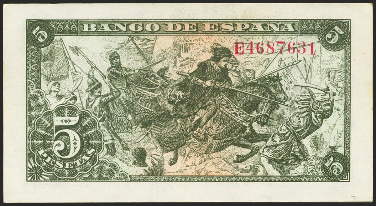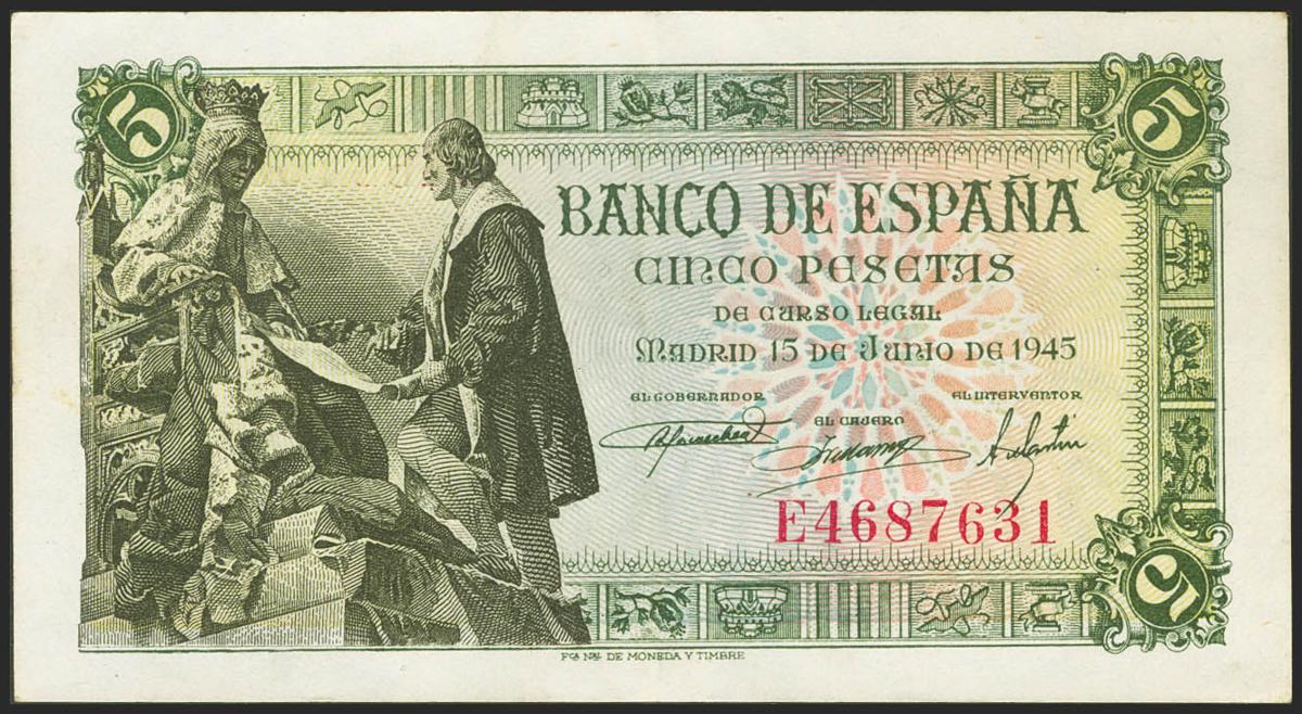 5 Pesetas. 15 de Junio de 1945. Serie E. (Edifil 2021: 449a). Conserva parte de su apresto original. EBC.