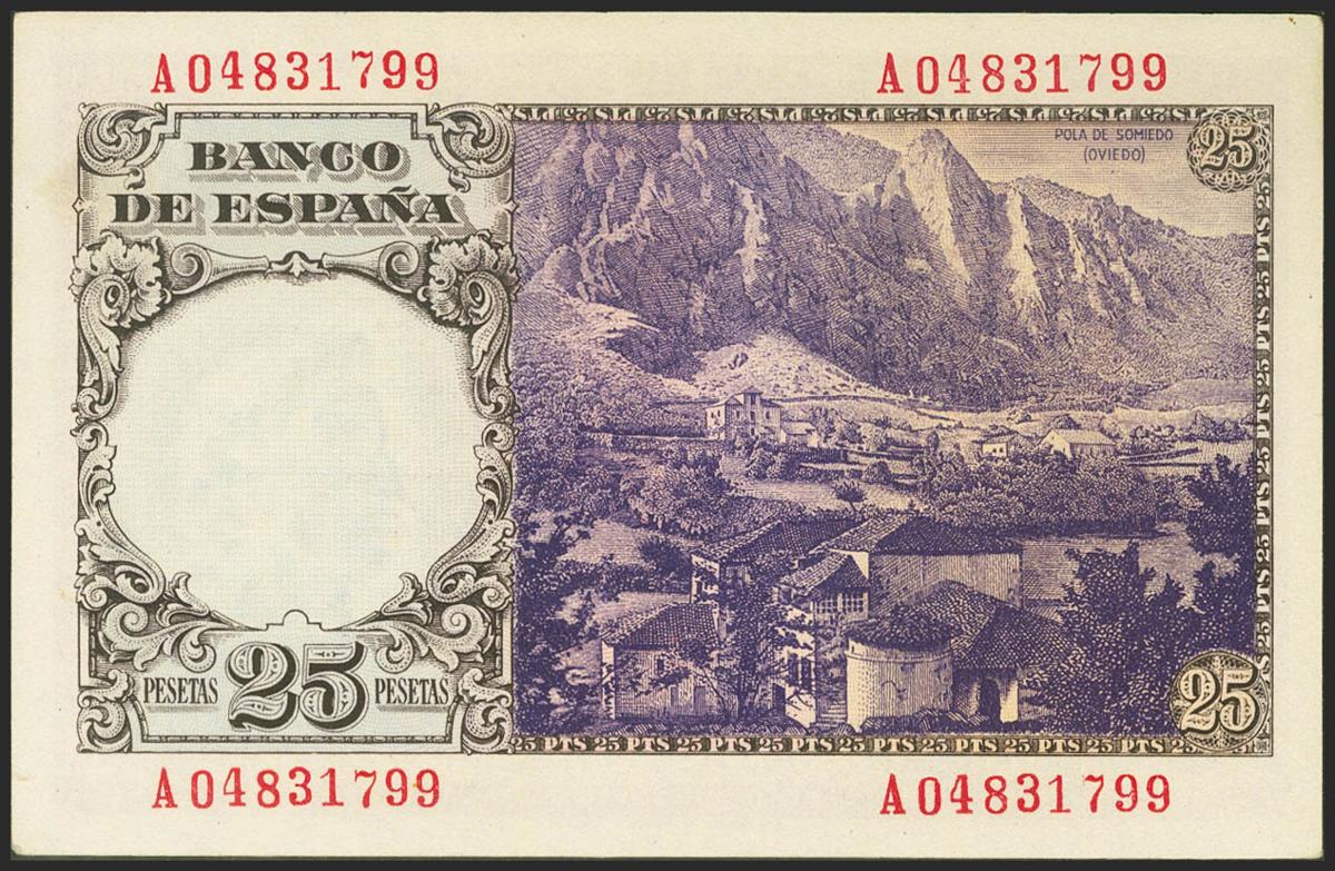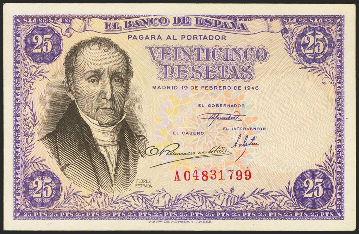 25 Pesetas. 19 de Febrero de 1946. Serie A. (Edifil 2021: 450a). Conserva gran parte de su apresto original. EBC++.