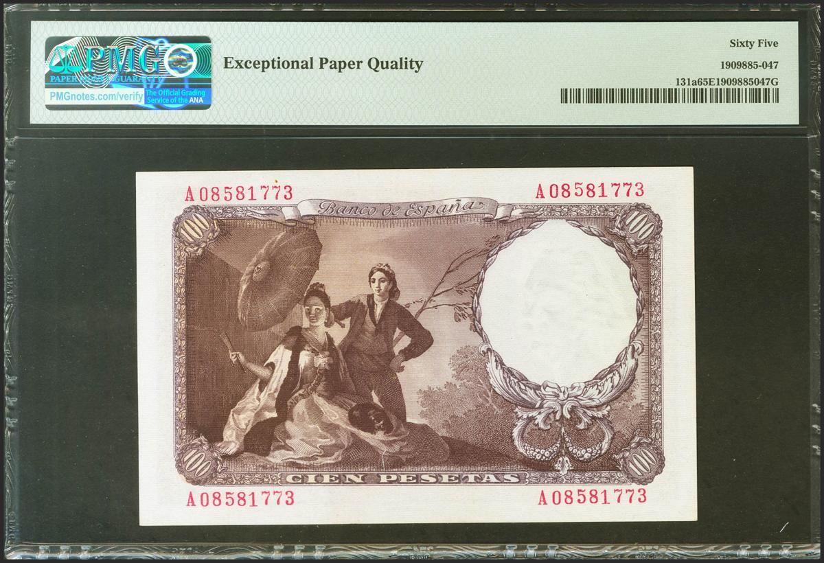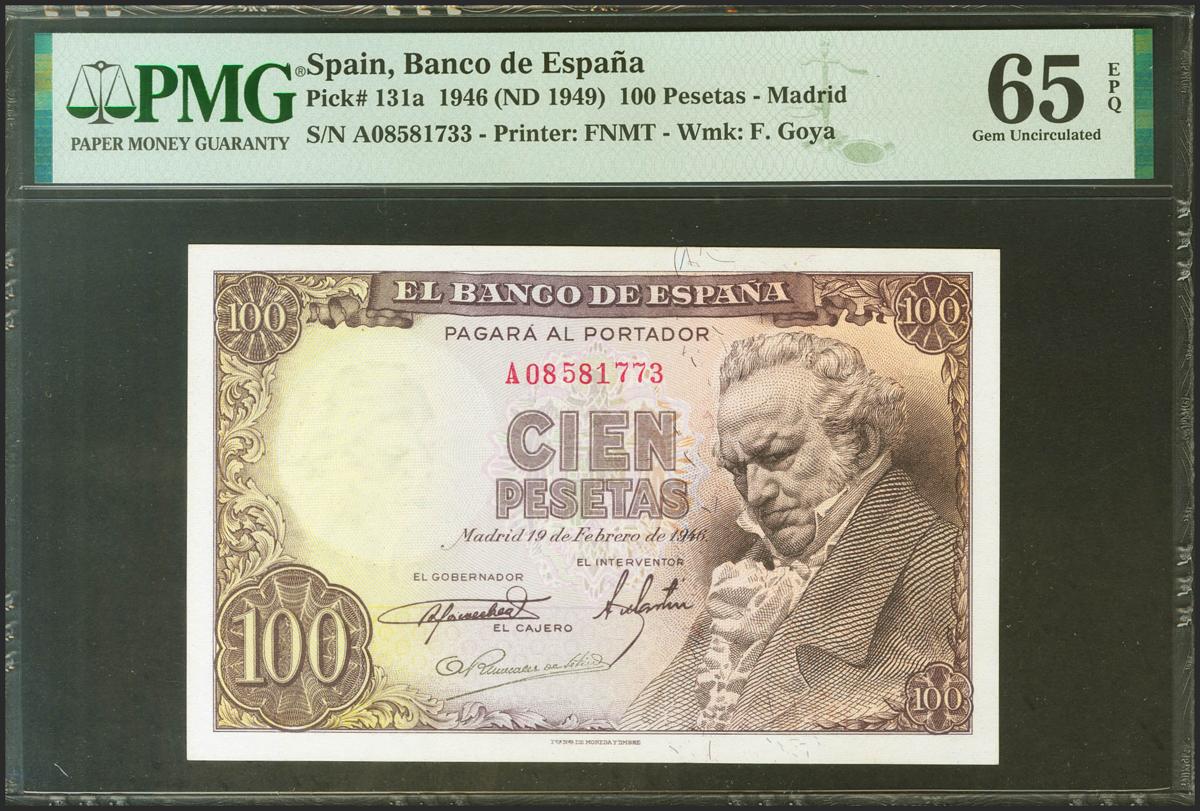 100 Pesetas. 19 de Febrero de 1946. Serie A. (Edifil 2021: 451a, Pick: 131a). Raro en esta calidad, apresto original. SC. Encapsulado PMG65EPQ.