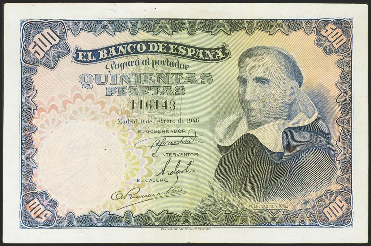500 Pesetas. 19 de Febrero de 1946. Sin serie. (Edifil 2021: 452). Inusual, en esta calidad conservando parte de su apresto original billete enormemente atractivo. EBC.