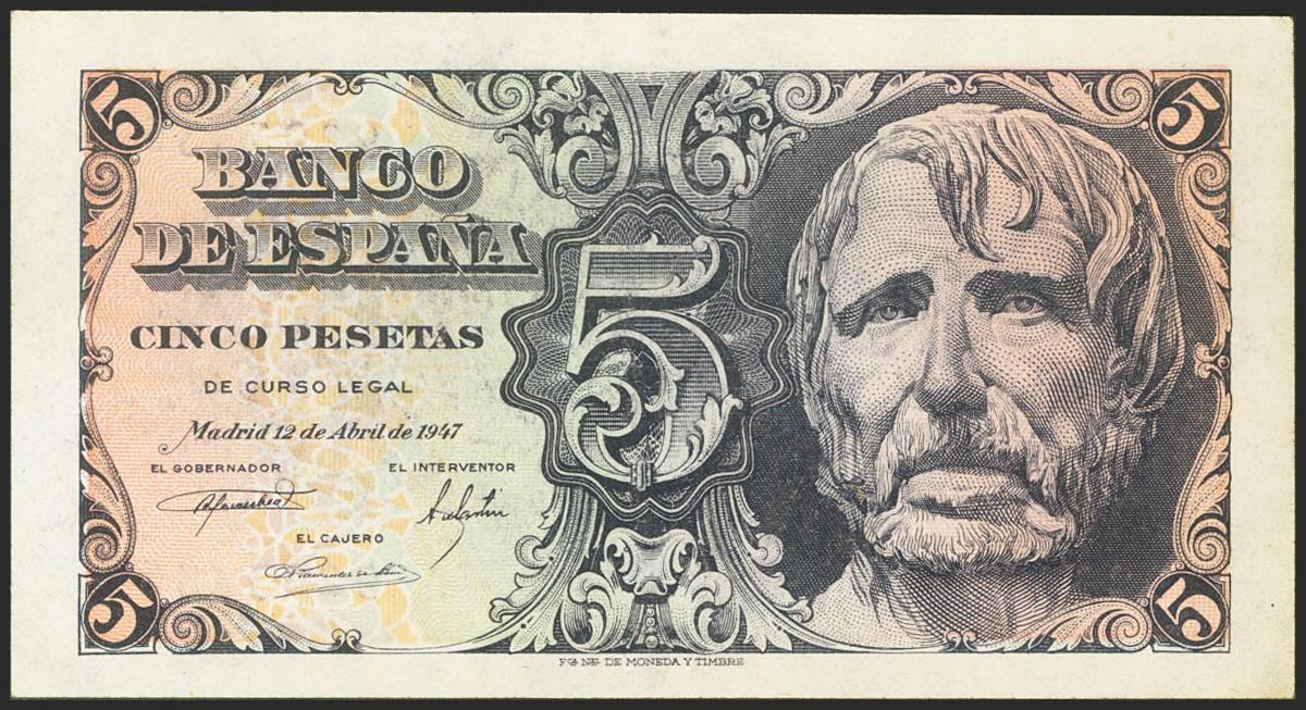 5 Pesetas. 12 de Abril de 1947. Sin serie. (Edifil 2021: 454). Conserva gran parte de su apresto original. EBC+.
