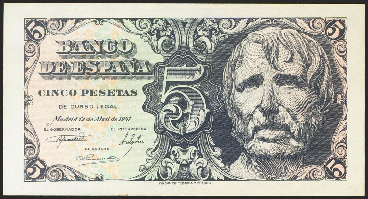 5 Pesetas. 12 de Abril de 1947. Serie D. (Edifil 2021: 454a). Apresto original. EBC++.