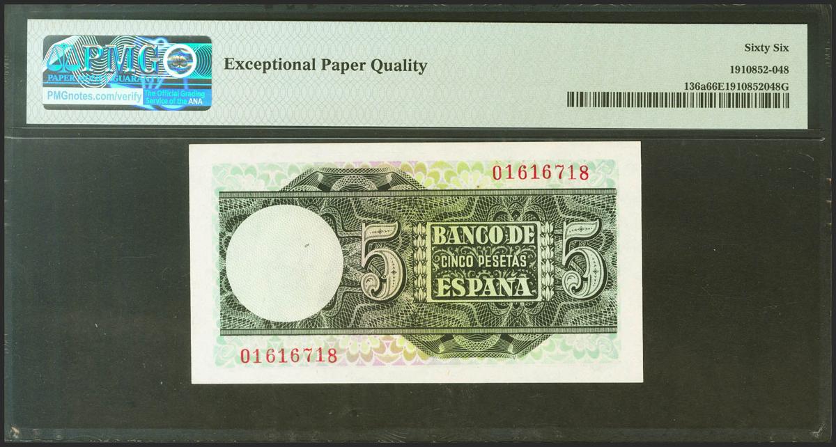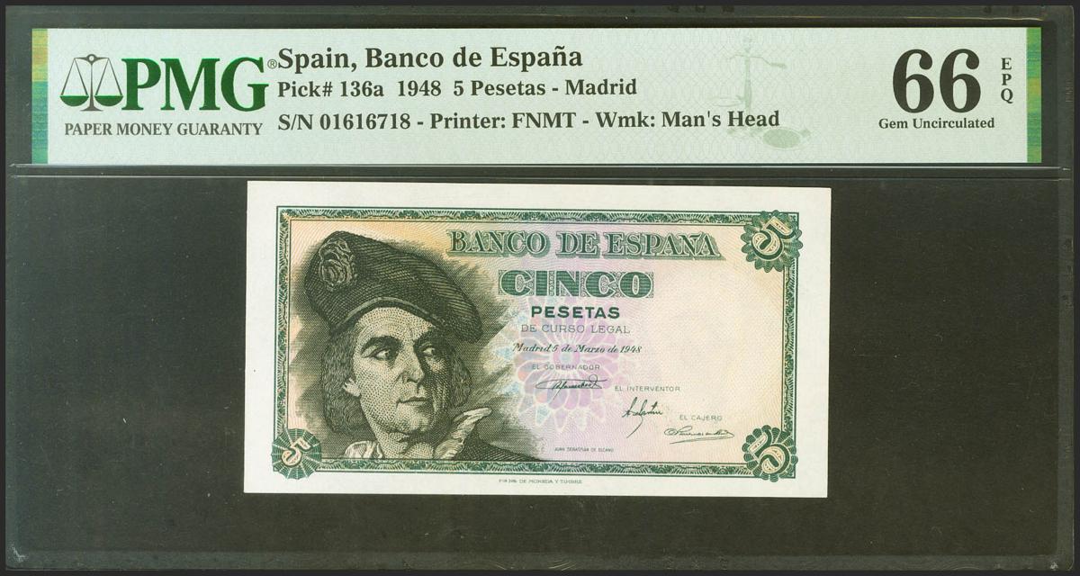 5 Pesetas. 15 de Marzo de 1948. Sin serie. (Edifil 2021: 455, Pick: 136a). Apresto original. SC. Encapsulado PMG66EPQ.