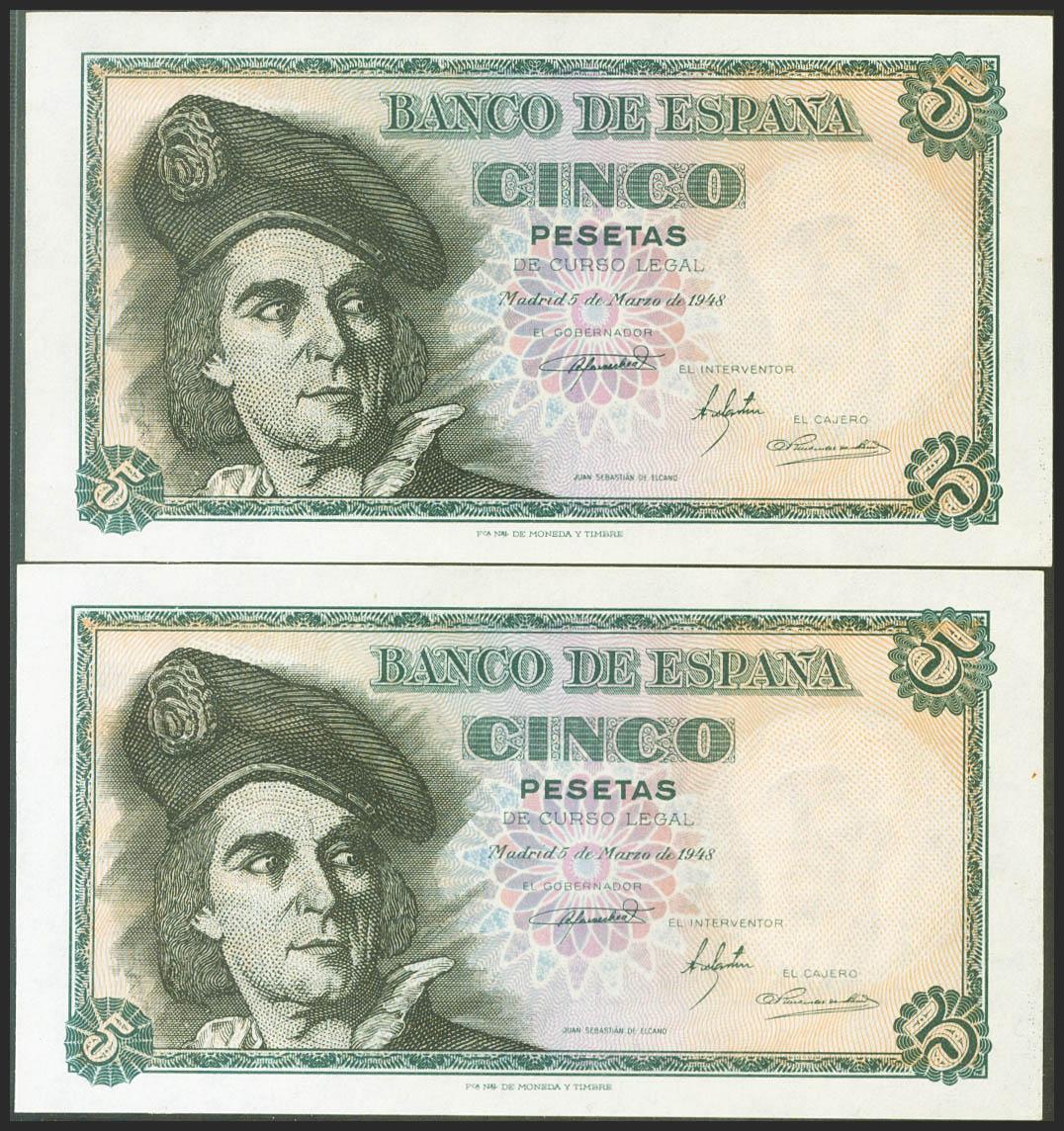 5 Pesetas. 5 de Marzo de 1948. Pareja correlativa. Serie A. (Edifil 2021: 455a). Apresto original. SC.