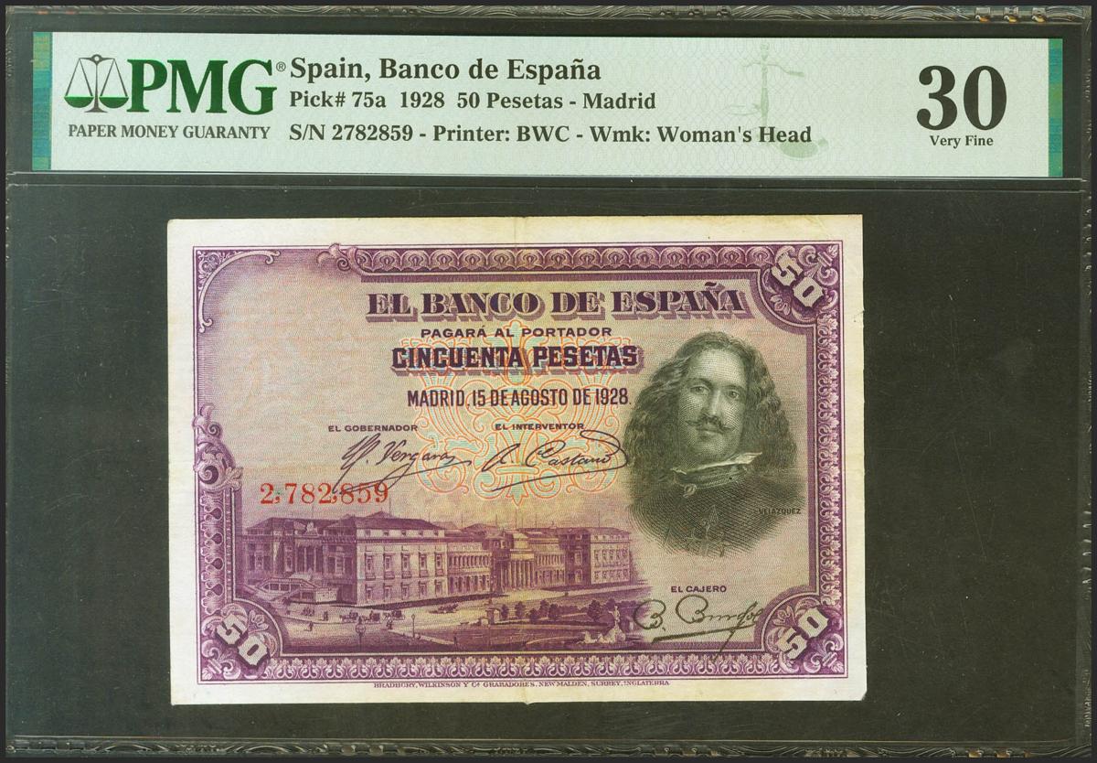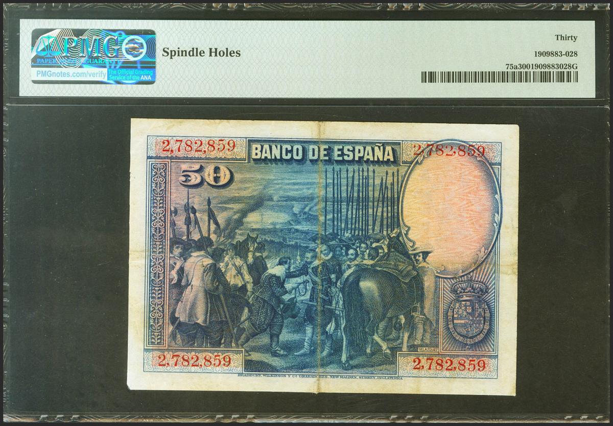 50 Pesetas. 15 de Agosto de 1928. Sin serie. (Edifil 2021: 329, Pick: 75a). Puntitos de grapa. MBC+. Encapsulado PMG30.