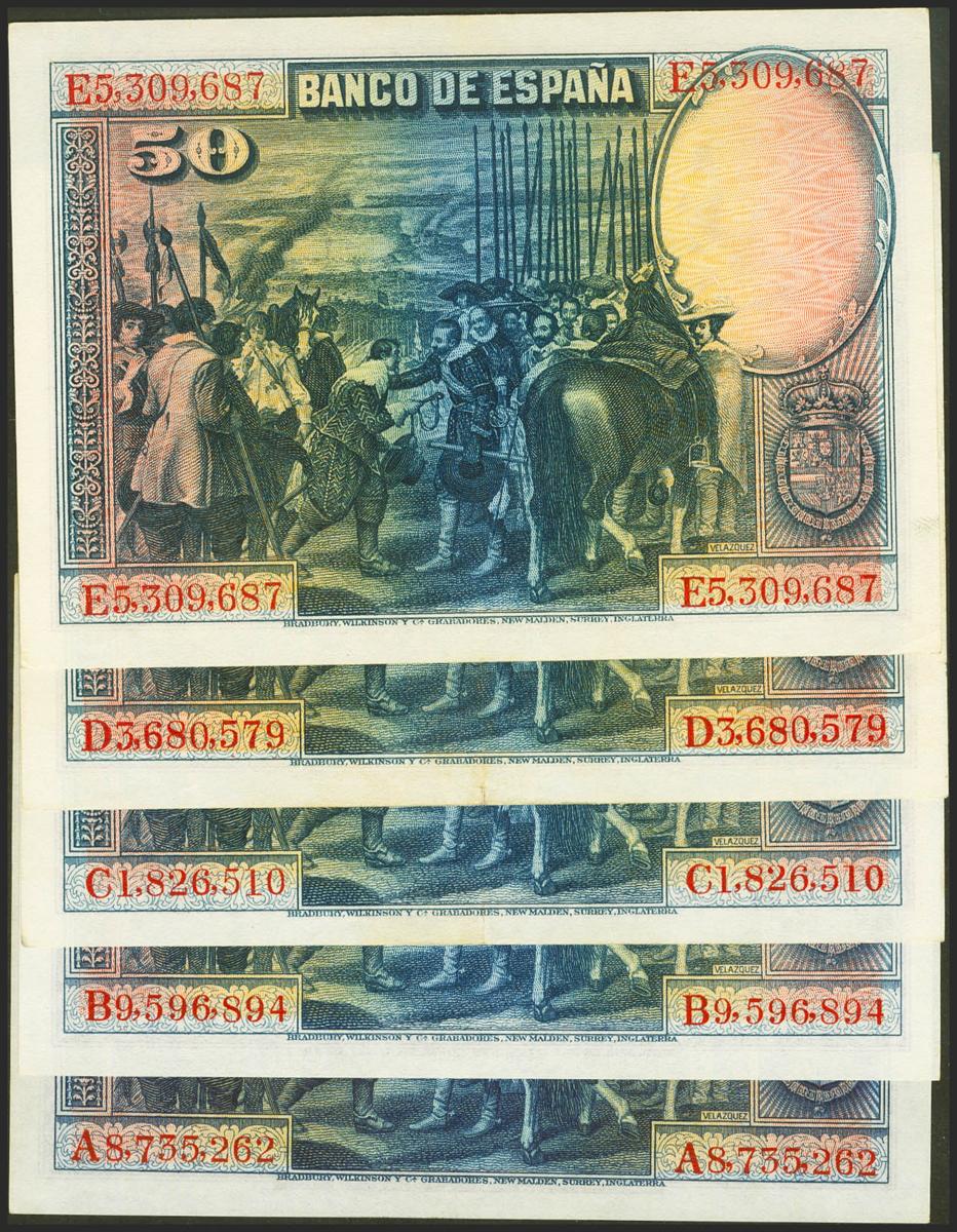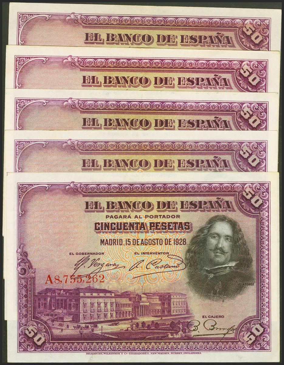 Muy interesante conjunto de 5 billetes de 50 Pesetas emitidos el 15 de Agosto de 1928, con las series A, B, C, D y E (Edifil 2021: 329a, 354), conservando gran parte de su apresto original. SC-/EBC.