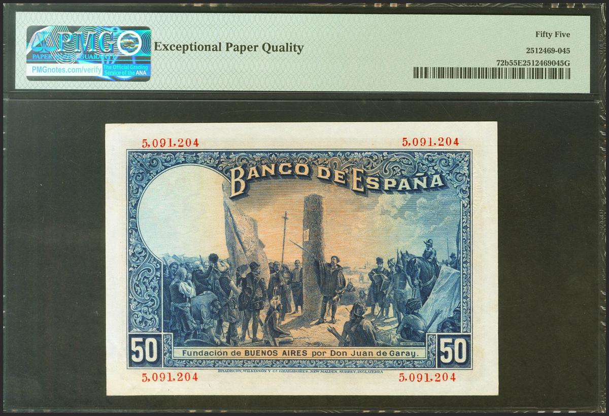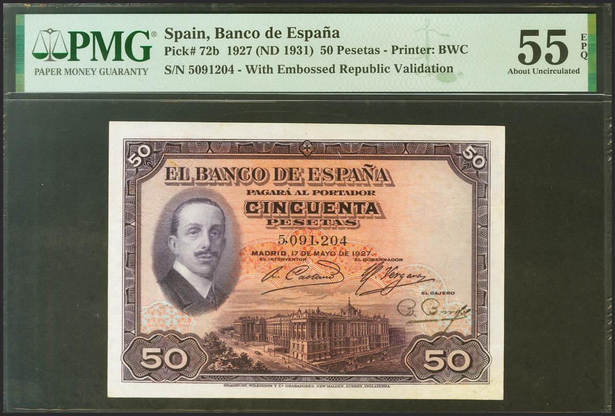 50 Pesetas. 17 de Mayo de 1927. Sin serie y sello en seco "Gobierno Provisional de la República / 14 Abril 1931". (Edifil 2021: 339). Raro en esta calidad, apresto original. EBC+. Encapsulado PMG55EPQ.