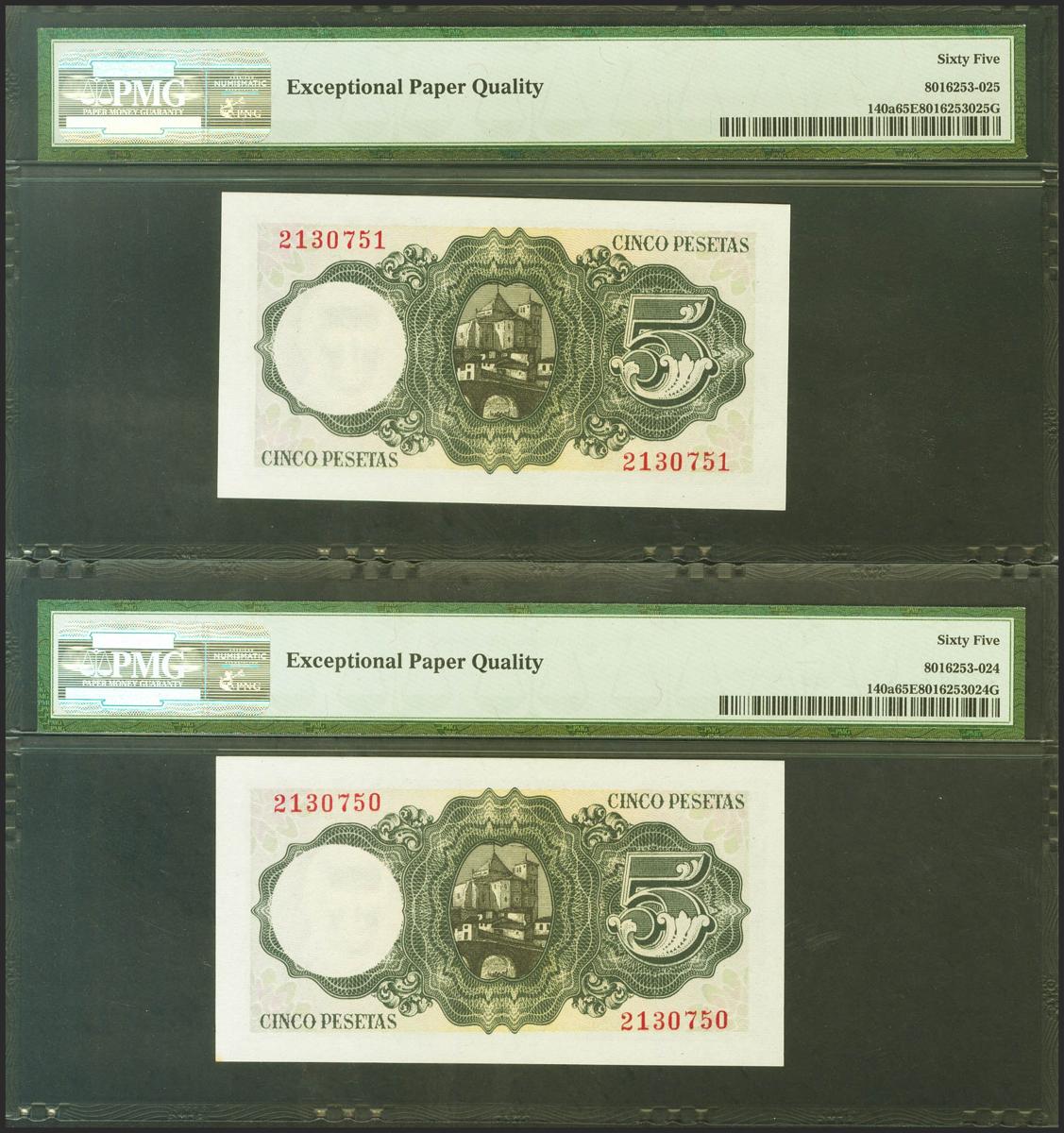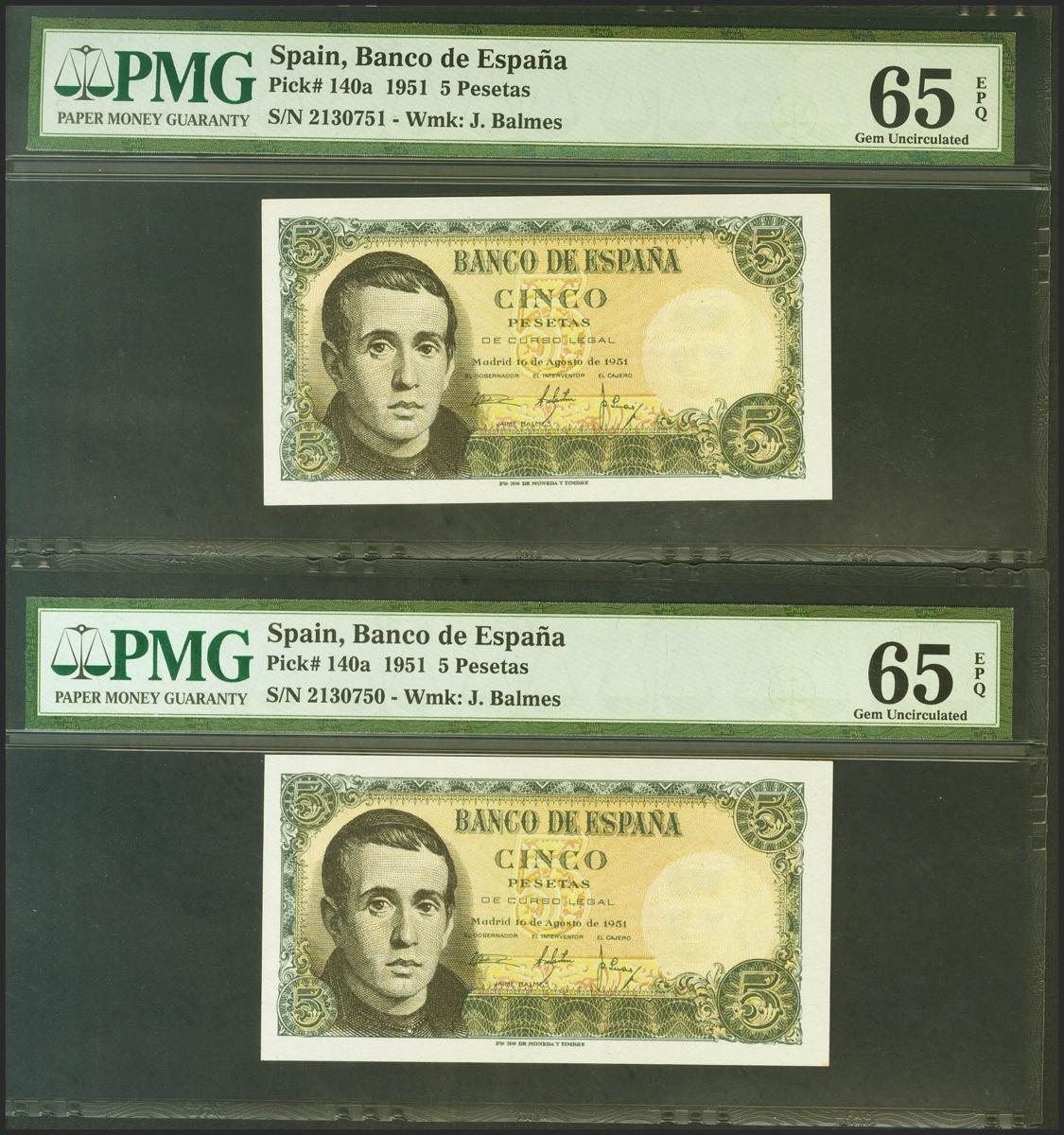 5 Pesetas. 16 de Agosto de 1951. Pareja correlativa. Sin serie. (Edifil 2021: 459, Pick: 140a). Inusual en esta calidad, apresto original. SC. Encapsulados PMG65EPQ, ambos.