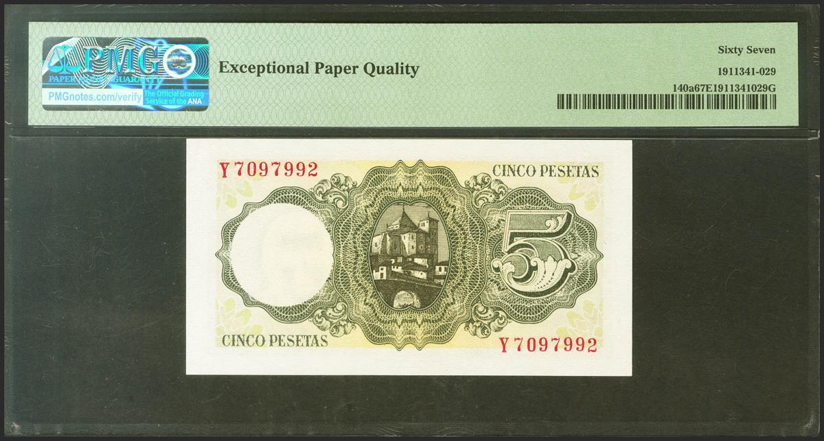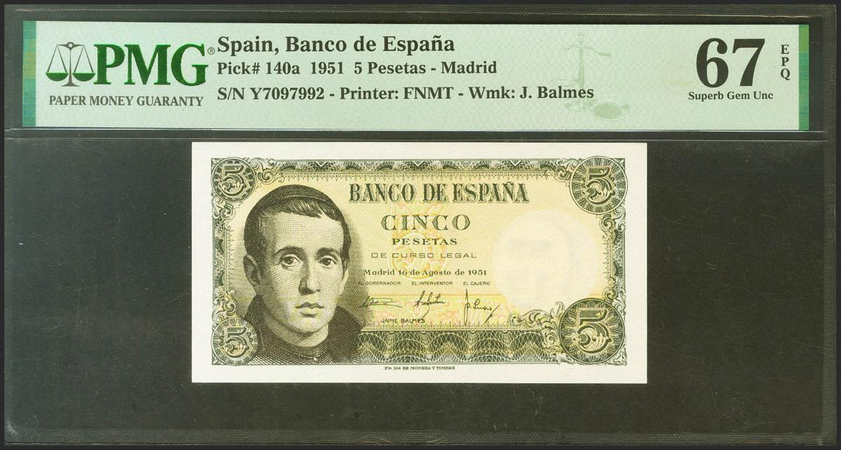 5 Pesetas. 16 de Agosto de 1951. Serie Y. (Edifil 2021: 459a, Pick: 140a). Muy raro en esta excepcional calidad, apresto original. SC. Encapsulado PMG67EPQ.