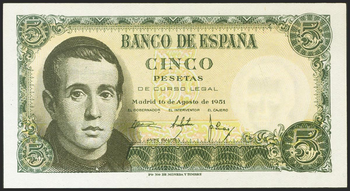 5 Pesetas. 16 de Agosto de 1951. Serie X. (Edifil 2021: 459a). Apresto original. SC-.